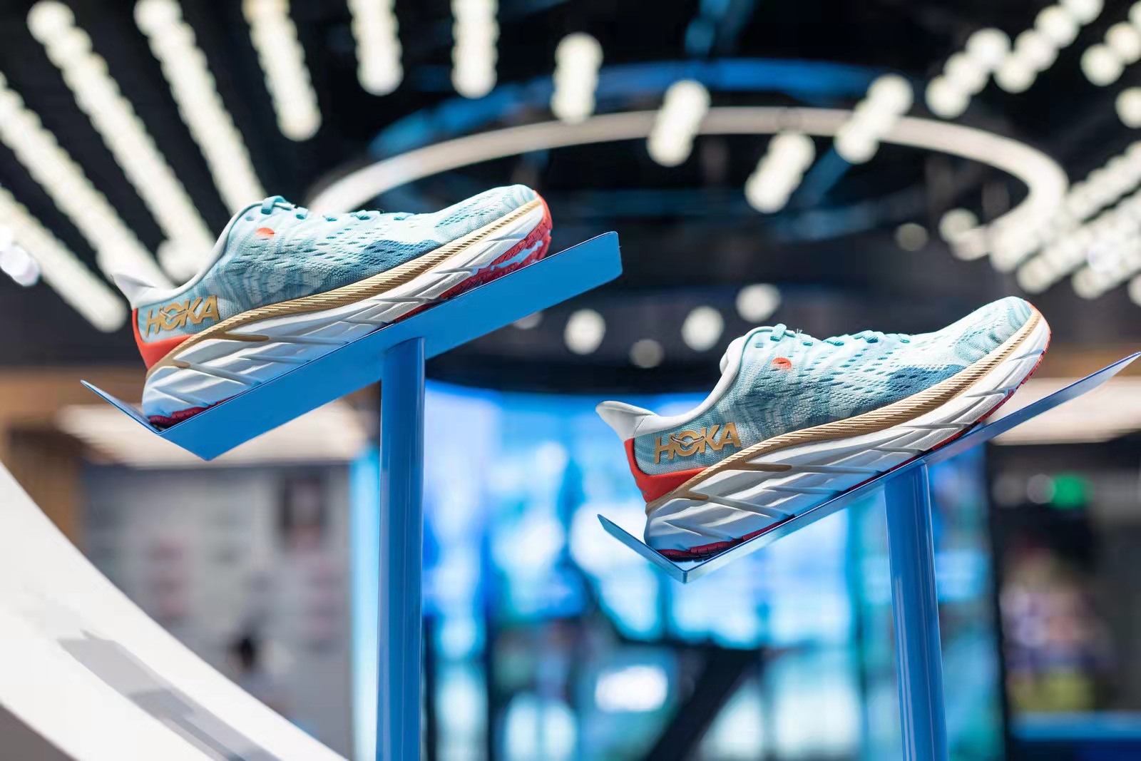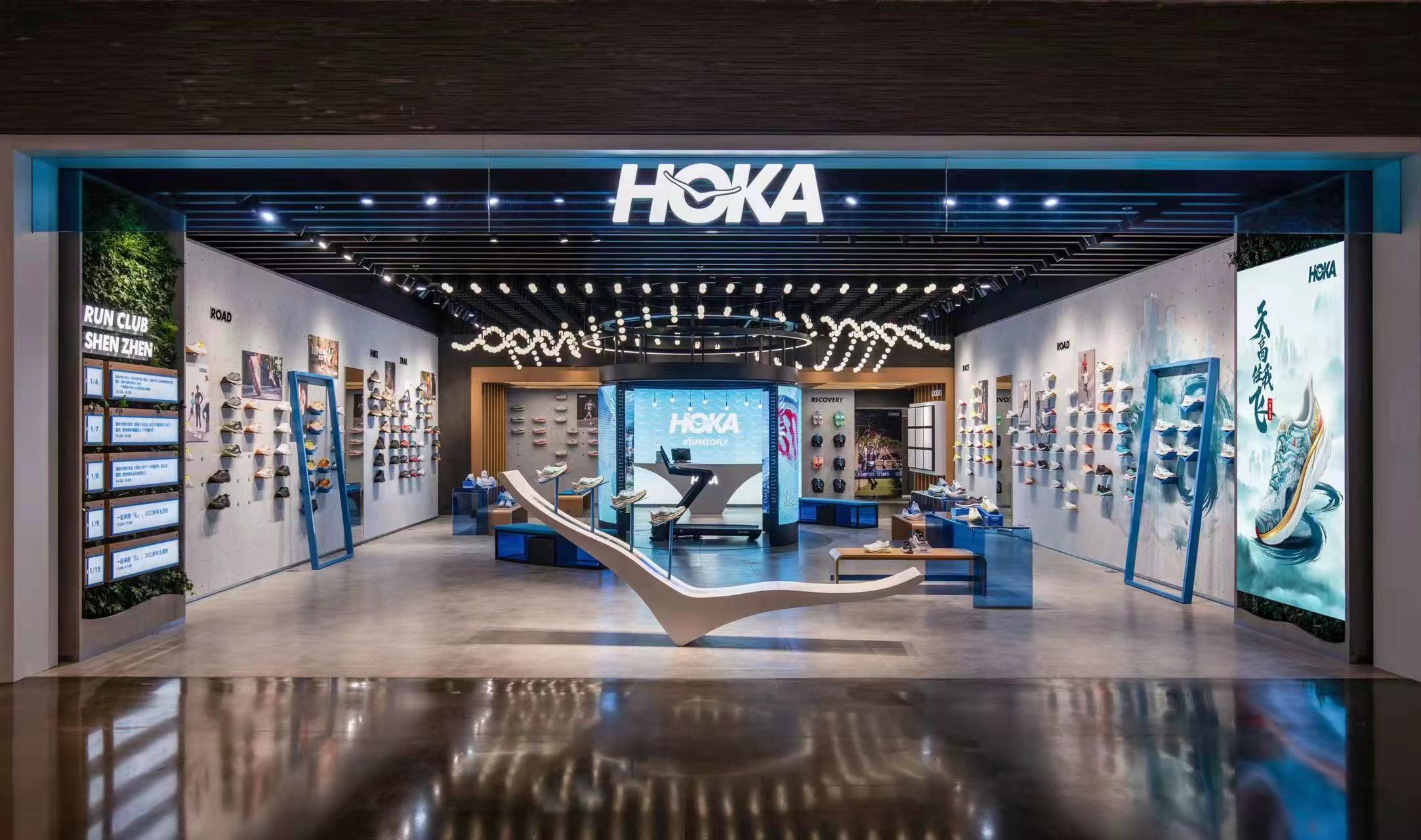 此外,沿襲品牌體驗店一直以來別具一格的設(shè)計風(fēng)格,華南首家品牌直營體驗店以“飛行”為設(shè)計主題,呈現(xiàn)活力與輕盈感,搭配頂部標志性的“飛鳥”燈光群的律動,營造出飛越天際的自由氛圍。不僅如此,店內(nèi)還設(shè)置了跑步機體驗區(qū)以及跑者試穿體驗區(qū)等貼心的體驗空間。跑者在購物前,便可率先在店內(nèi)體驗運動的樂趣,享受HOKA所打造的創(chuàng)新跑步體驗。