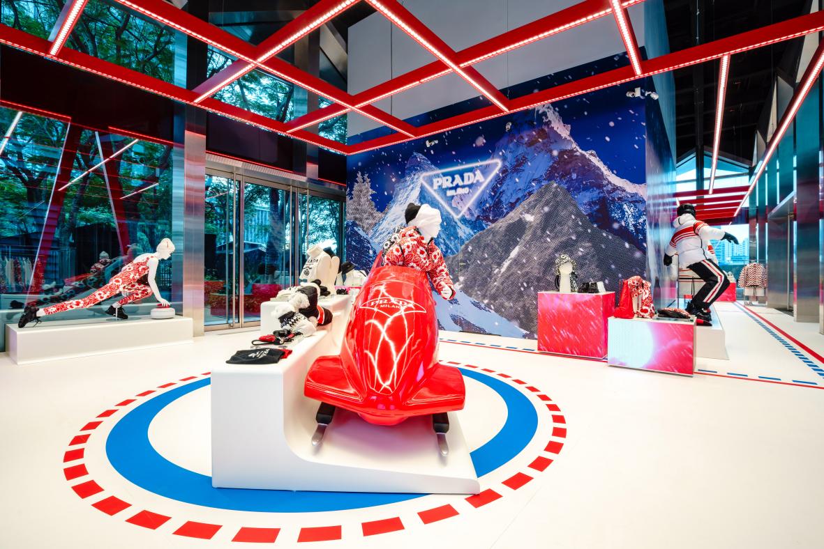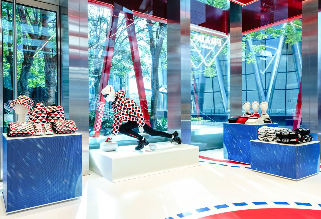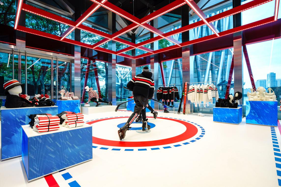 據(jù)了解,全新“冰上普拉達(dá)”限時(shí)店在深圳灣萬象城亮相,從冰球場線條得到靈感的活力紅藍(lán)圖案鋪陳于雪白地面,用臺(tái)階元素進(jìn)行定義,同時(shí),形似記分牌的紅色 LED燈條滾動(dòng)顯示Prada徽標(biāo)。體育賽場的看臺(tái)搖身變成顧客活動(dòng)區(qū),雪橇平臺(tái)化作展示臺(tái),擺出經(jīng)典運(yùn)動(dòng)姿態(tài)的人體模特成為全場焦點(diǎn)。
