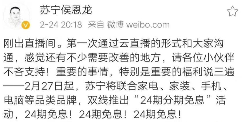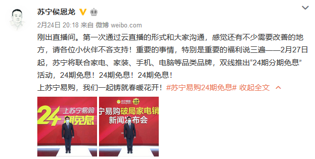 2月24日晚8點(diǎn),一場(chǎng)特殊的線(xiàn)上發(fā)布會(huì)在蘇寧矩陣直播平臺(tái)全面啟動(dòng)。蘇寧侯恩龍化身主播,宣布開(kāi)啟一場(chǎng)公司復(fù)工與市場(chǎng)復(fù)蘇的“救市”行動(dòng),拉開(kāi)家電銷(xiāo)售破局大幕。