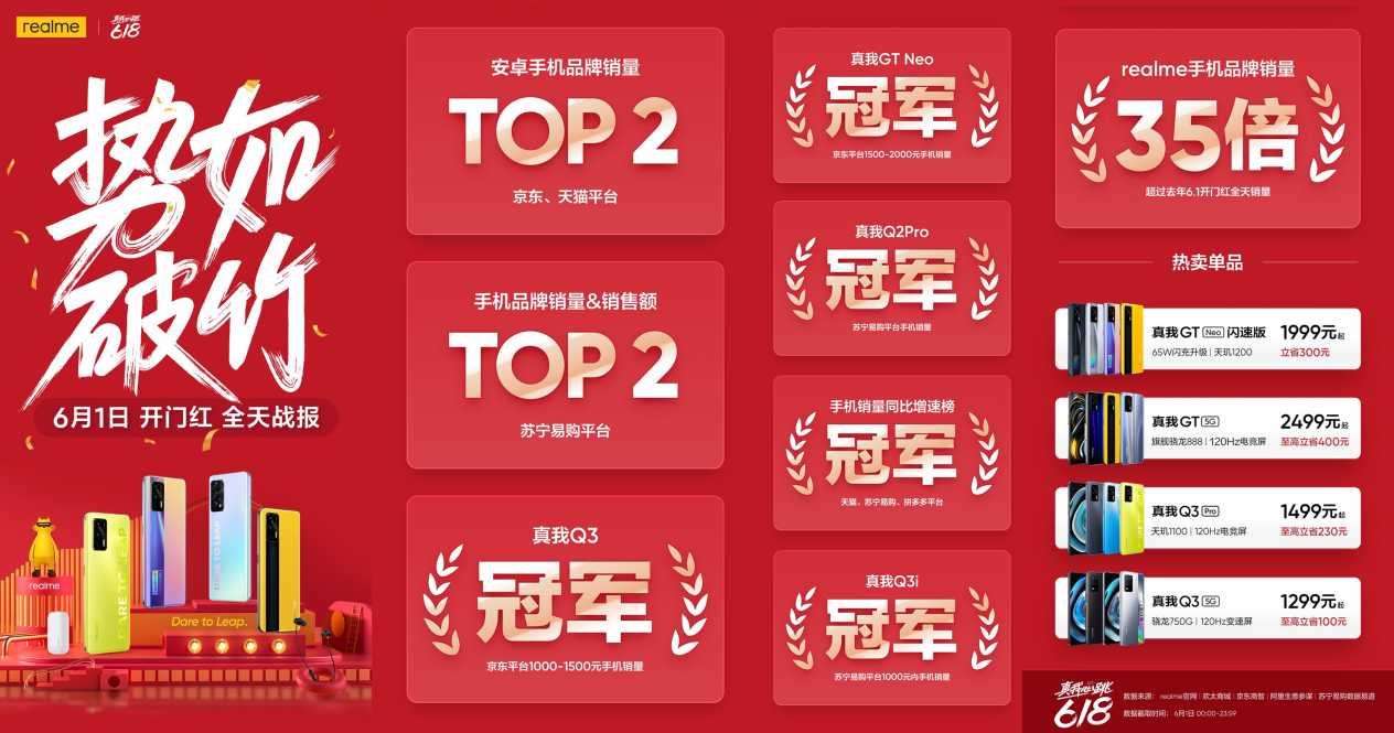 智能手機(jī)品牌realme真我公布618開門紅首日戰(zhàn)報(bào):realme真我斬獲京東、天貓平臺(tái)安卓手機(jī)品牌銷量TOP2,蘇寧易購(gòu)手機(jī)品牌銷量&銷售額TOP2,成為天貓、蘇寧易購(gòu)、拼多多平臺(tái)手機(jī)銷量同比增速榜冠軍,手機(jī)品牌銷量超過去年開門紅全天銷量35倍,創(chuàng)下品牌618開門紅歷史最佳成績(jī)!