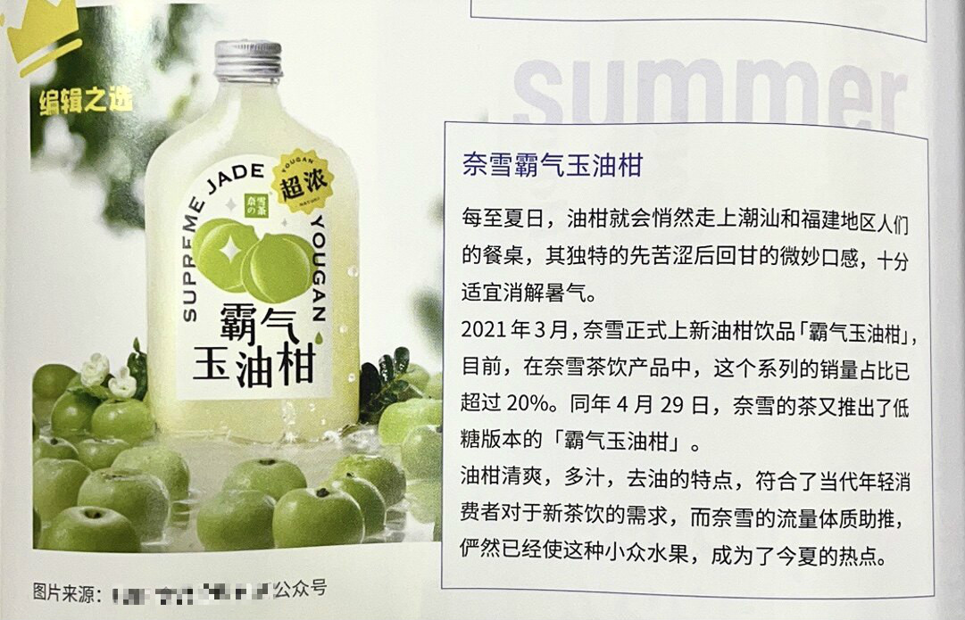 奈雪的茶推出的“霸氣玉油柑”產(chǎn)品特色突出,獲得了Wow Food雜志“編輯之選”的榮譽稱號。
