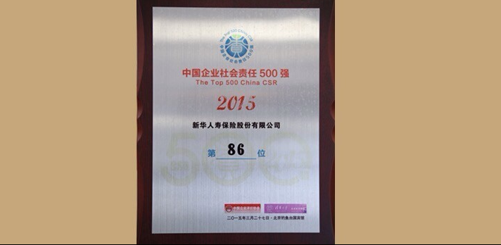 2015年4月,在由中國企業(yè)評價協(xié)會、清華大學社會科學學院聯(lián)合首次發(fā)布的“2015中國企業(yè)社會責任500強”榜單中,新華保險從1600家候選企業(yè)中脫穎而出,入圍榜單第86位。