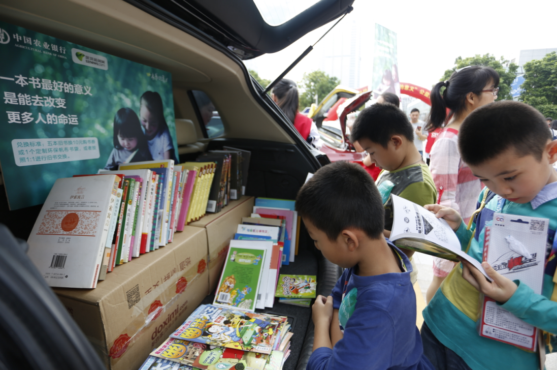 本次活動將車尾箱作為展臺,活動參與者按照1:1進行舊書交換,或到深圳農(nóng)行現(xiàn)場設(shè)置的捐書點捐獻舊書,每捐出五本舊書,可獲得由農(nóng)行送出的10元書劵?;顒游齺碜藻\田小學(xué)、深圳實驗學(xué)校中學(xué)部及深圳新聞網(wǎng)網(wǎng)友共40多個家庭參與,僅兩個小時便交出漂亮的“成績單”,現(xiàn)場交換圖書900多本,捐贈愛心書籍1000余本。