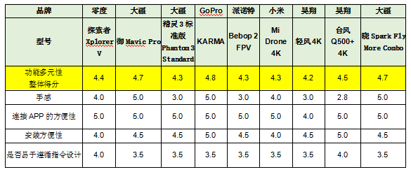 整體得分最佳為GoPro“KARMA”,獲4.8分;其次是大疆的“御Mavic Pro”和“曉Spark Fly More Combo”,獲4.7分。詳見(jiàn)下表。