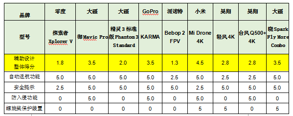 總評(píng):小米“Mi Drone 4K”輔助設(shè)計(jì)表現(xiàn)最好,獲評(píng)4.5分。派諾特“Bebop 2 FPV”和零度“探索者Xplorer V”表現(xiàn)較差,僅獲評(píng)1.3分和1.8分。詳見(jiàn)下表。