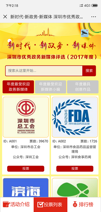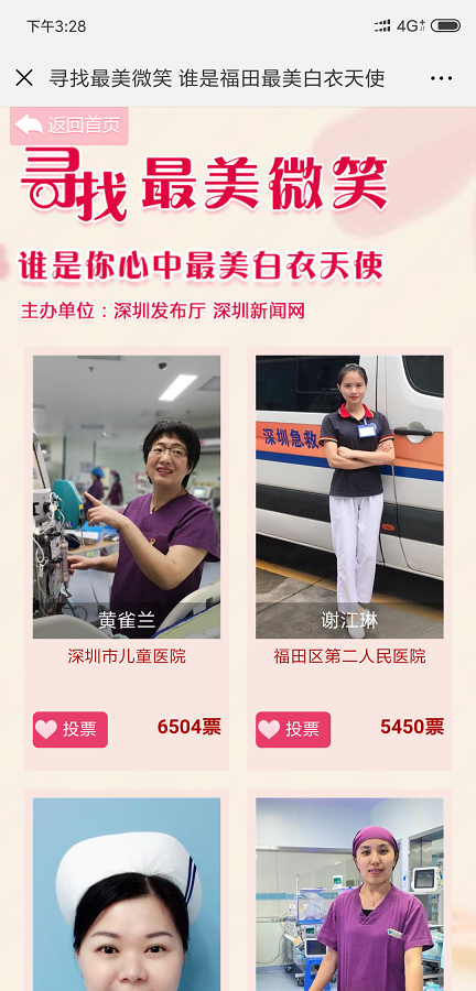 ② 多個(gè)投票活動(dòng)已經(jīng)形成良好群眾效應(yīng),合作方主辦方多屆舉辦,每屆舉辦均由深圳新聞網(wǎng)負(fù)責(zé)投票系統(tǒng)開(kāi)發(fā),例如:健康場(chǎng)所投票、集團(tuán)攝影大賽評(píng)選投票、政務(wù)類(lèi)投票。形成了良好品牌效應(yīng)和示范,往往一個(gè)區(qū)舉辦的投票活動(dòng)其他區(qū)會(huì)跟進(jìn)舉辦,形成系列投票,例如:“最美護(hù)士”系列投票,“最美醫(yī)生”系列投票,“最美教師”系列投票,“最佳政務(wù)”系列投票等;