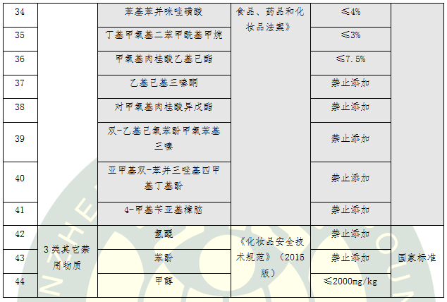 c.防曬劑(15種):苯基苯并咪唑磺酸、二苯酮 -4和二苯酮-5、對氨基苯甲酸、對甲氧基肉桂酸異戊酯、 PABA乙基己酯、丁基甲氧基二苯甲?;淄椤W克立林、甲氧基肉桂酸乙基己酯、水楊酸乙基己酯、胡莫柳酯、乙基己基三嗪酮、亞甲基雙 -苯并三唑基四甲基丁基酚、雙 -乙基己氧苯酚甲氧苯基三嗪、二苯酮 -3、4-甲基芐亞基樟腦