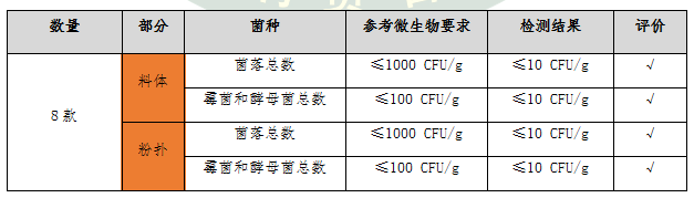 檢測結(jié)果顯示:8款氣墊粉底的粉撲和料體的菌落總數(shù)、霉菌和酵母菌總數(shù)檢出量均低于10 CFU/g,遠低于產(chǎn)品微生物的標準要求限值,屬于安全范圍,消費者無需過度擔心。