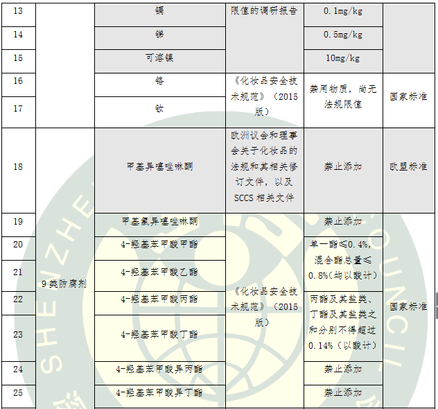 本次比較試驗檢測項目廣泛征求了企業(yè)、業(yè)內(nèi)專家和第三方檢測機構(gòu)的意見,不僅依據(jù)了現(xiàn)行國家標準,而且在國標基礎(chǔ)上結(jié)合嚴格的歐盟標準 《歐盟化妝品法規(guī)EC1223/2009及其相關(guān)修訂文件》、《歐盟消費者安全科學委員會(SCCS)關(guān)于化妝品安全的第九版指南》、德國聯(lián)邦消費者保護和食品安全局(BVL)關(guān)于可避免雜質(zhì)重金屬限值的調(diào)查報告、美國《聯(lián)邦食品、藥品和化妝品法案》、日本厚生勞動省《藥事法》以及其它相關(guān)標準、法規(guī)和技術(shù)文件的要求,采用國家標準檢測方法、實驗室通用方法等手段進行檢測,從44項指標展開氣墊粉底安全性品質(zhì)大比拼,詳細項目與要求見表1。
