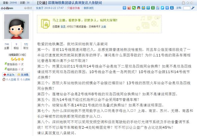 2月22日,有市民在深圳論壇發(fā)帖《敬愛的地鐵集團(tuán),我對深圳地鐵有八條疑問》,對深圳地鐵提出一系列專業(yè)且詳細(xì)的問題:“11號線限速問題由來已久”“11號線商務(wù)車廂比普通車廂冷清不少卻不取消”,對新建地鐵線路的換乘方式、14號線采用普通車廂還是商務(wù)車廂、西麗站的規(guī)模等建設(shè)方案提出疑問,并質(zhì)疑地鐵站出入口使用字母標(biāo)識而不是數(shù)字標(biāo)識是否合理。帖文中也提出了“采用變頻空調(diào)”“手動(dòng)燈光調(diào)節(jié)系統(tǒng)及手動(dòng)音量調(diào)節(jié)系統(tǒng)”“每節(jié)車廂能有2-4處輪椅固定帶”等建議,并希望“車站內(nèi)公益廣告占比要達(dá)到45%”。