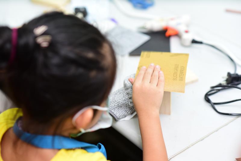 “小朋友們,像我一樣,找到這兩個結(jié)構(gòu)部件,然后將他們拼接在一起……”現(xiàn)場,老師一邊為小朋友們講解著手工音樂盒的搭建步驟,一邊現(xiàn)場為孩子們示范制作過程。坐在四周的“小小木匠”們一個個伸長了脖子,或站或坐,看著老師演示,一字不落的將老師的講解銘記在心。“老爸,鋸子原來要以這樣的角度去鋸才更省力呀?!币晃粍倓傮w驗過木工工具的小朋友滿臉興奮的跟自己的父親說道。