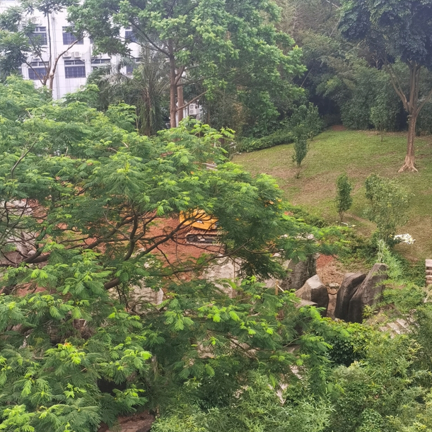 其次,從今年7月起,在二層架高平臺之上的山坡綠地,存在樹木砍伐和綠地草坪遭毀壞的情況,且有挖掘機(jī)開入并停泊,而現(xiàn)場也沒有任何工程信息和告示。