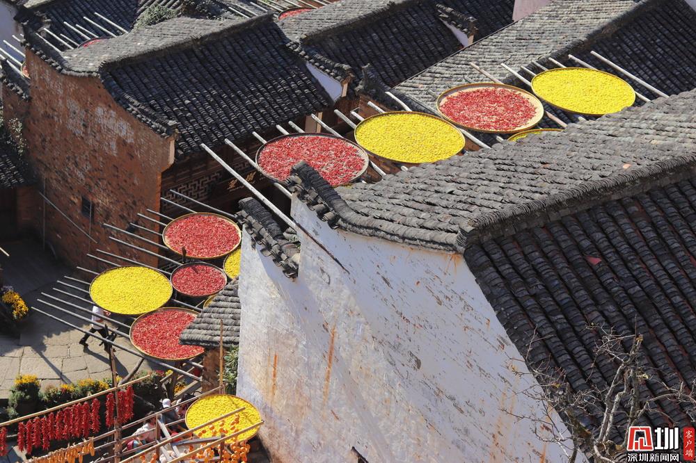 見圳客戶端·深圳新聞網(wǎng)2020年11月25日訊 江西婺源縣篁嶺村獨(dú)特的“曬秋”農(nóng)俗景觀。篁嶺村位于江西省上饒市婺源縣東北部,是著名的“曬秋”文化起源地,也是一座距今近六百年歷史的徽州古村。每當(dāng)日出山頭,數(shù)百棟徽派古民居在百米落差的坡面錯落排布,整個山間村落徽式民居土磚外墻與曬架上五彩繽紛豐收成果組合,繪就出“曬秋”農(nóng)俗特色景觀。