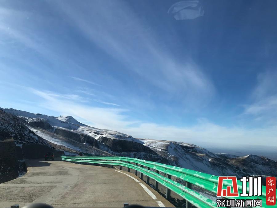 山上積雪覆蓋,與天邊的景色相互交映成一幅美麗的風(fēng)景畫。