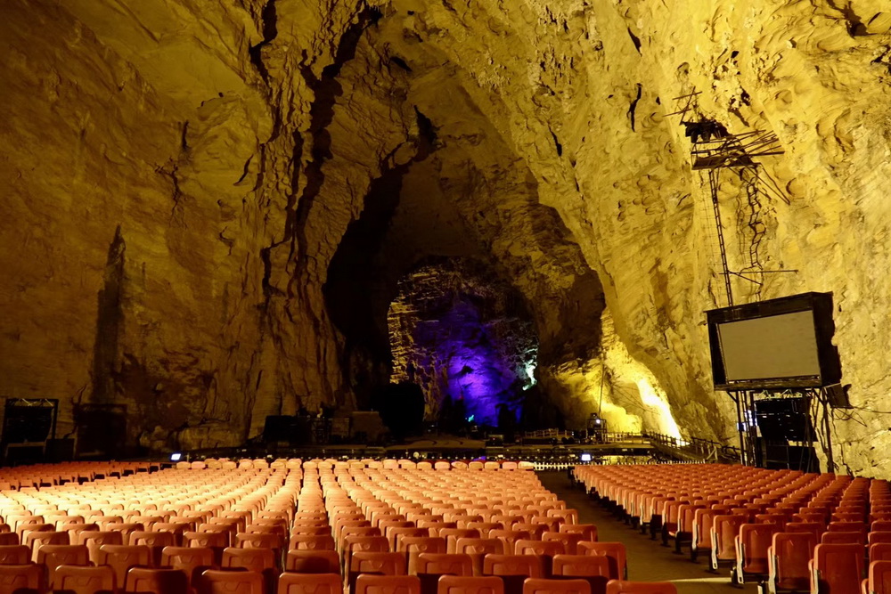 旱洞里現(xiàn)在有兩個(gè)劇場,有定時(shí)的激光和歌舞表演。水洞里有地下瀑布10余處。李仁奇 攝