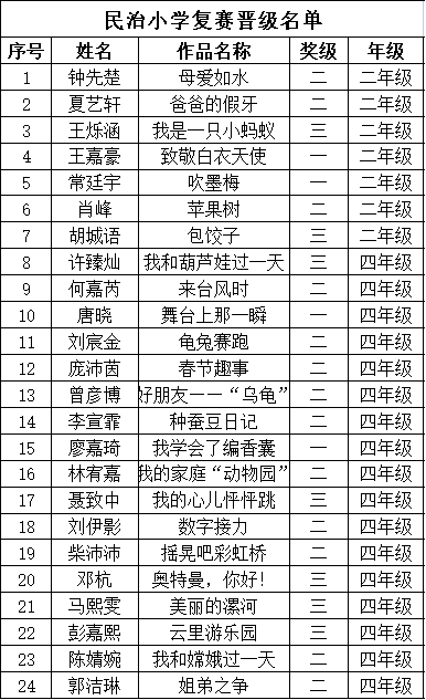 自2021年1月,活動(dòng)征稿啟動(dòng)以來,獲得了深圳市廣大中小學(xué)生、教師、文學(xué)愛好者的熱烈響應(yīng)積極參與,吸引了深圳百余所學(xué)校的上萬人關(guān)注報(bào)名?,F(xiàn)公布龍華區(qū)民治小學(xué)晉級復(fù)賽名單如下: