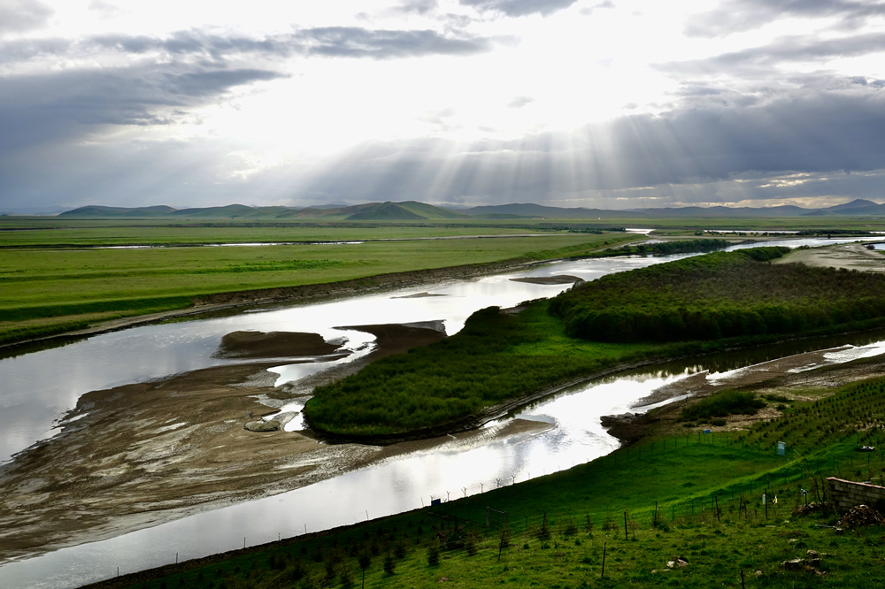 在陽光的照耀下,水面上閃耀著粼粼波光,遠處群山沐浴也在一片霞光中。李仁奇 攝