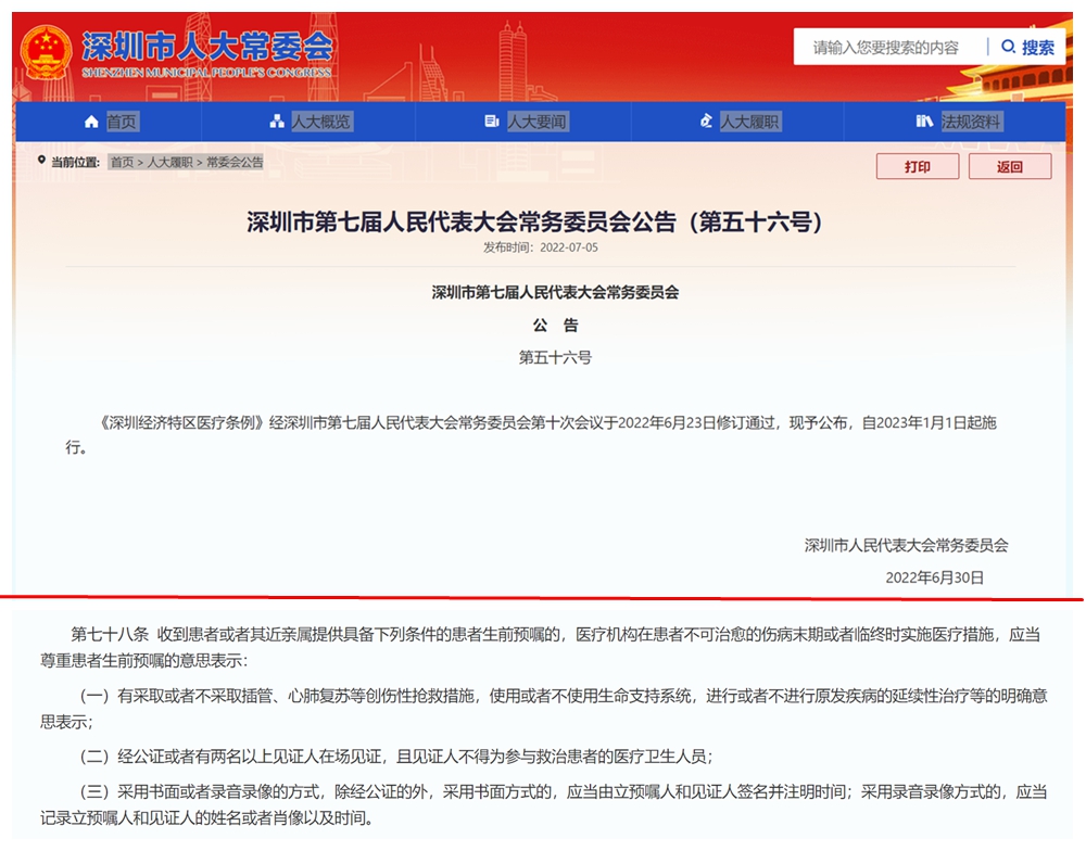 深圳市人大常委會官網(wǎng)頁面截圖及《深圳經(jīng)濟特區(qū)醫(yī)療條例》第七十八條內(nèi)容。