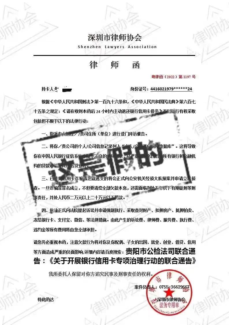 讀特客戶端·深圳新聞網2022年10月10日訊(記者 翁任瑩 張玲)近日,有人假冒“深圳市律師協(xié)會”名義發(fā)出催收信用卡債務的所謂“律師函”,并蓋上“深圳市律師協(xié)會”法務專用章。