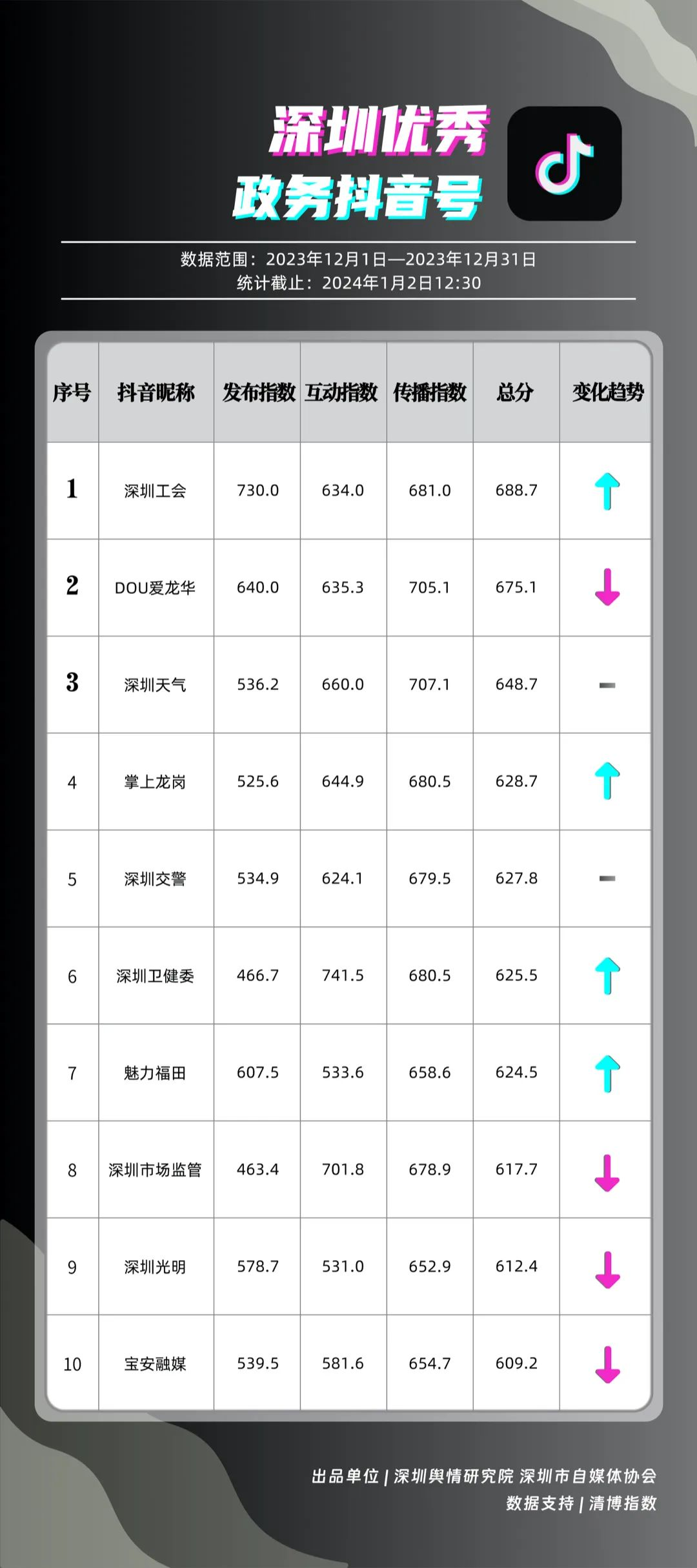 深圳新聞網(wǎng)1月16日訊(記者 陳曉君 實(shí)習(xí)生 張馳)2024年1月15日,《深圳優(yōu)秀政務(wù)新媒體矩陣》(2023年12月期)正式發(fā)布,共有10個(gè)新媒體矩陣被評(píng)為“優(yōu)秀”,分別是市氣象局、市衛(wèi)生健康委、龍崗區(qū)、福田區(qū)、龍華區(qū)、光明區(qū)、市應(yīng)急管理局、寶安區(qū)、羅湖區(qū)、市市場(chǎng)監(jiān)督管理局。上述優(yōu)秀矩陣在內(nèi)容質(zhì)量、更新頻率、粉絲互動(dòng)等方面穩(wěn)定性較高,獲得公眾的關(guān)注與支持。