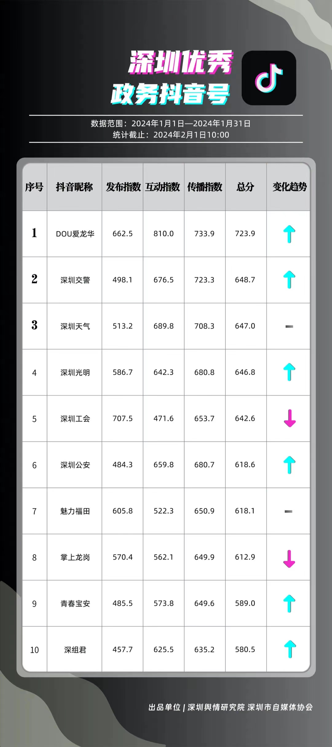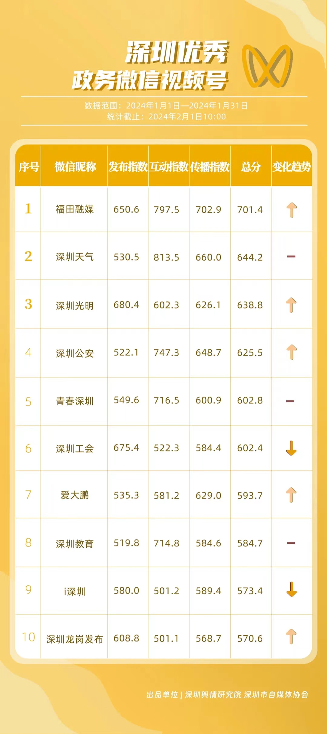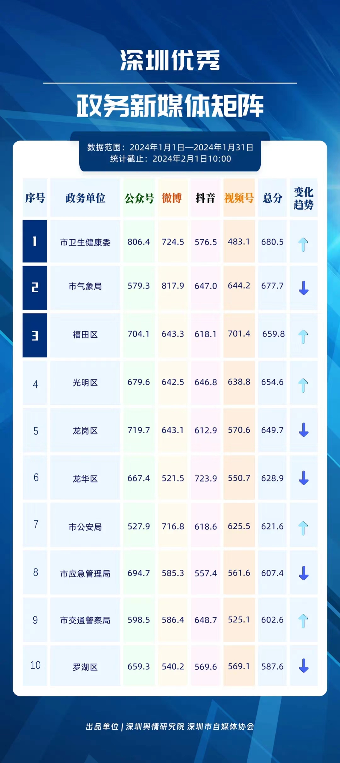 深圳新聞網(wǎng)2月9日訊(記者 陳曉君 實習(xí)生 張馳)2月8日,深圳輿情研究院、深圳市自媒體協(xié)會聯(lián)合推出《深圳優(yōu)秀政務(wù)新媒體矩陣》(2024年1月期),市衛(wèi)生健康委、市氣象局、福田區(qū)、光明區(qū)、龍崗區(qū)、龍華區(qū)、市公安局、市應(yīng)急管理局、市交通警察局、羅湖區(qū)的新媒體矩陣獲評“深圳優(yōu)秀政務(wù)新媒體矩陣”。這些矩陣在內(nèi)容發(fā)布、受眾互動和信息傳播方面取得了較好成績,并在深圳政務(wù)新媒體規(guī)范有序發(fā)展進(jìn)程中發(fā)揮著積極作用。