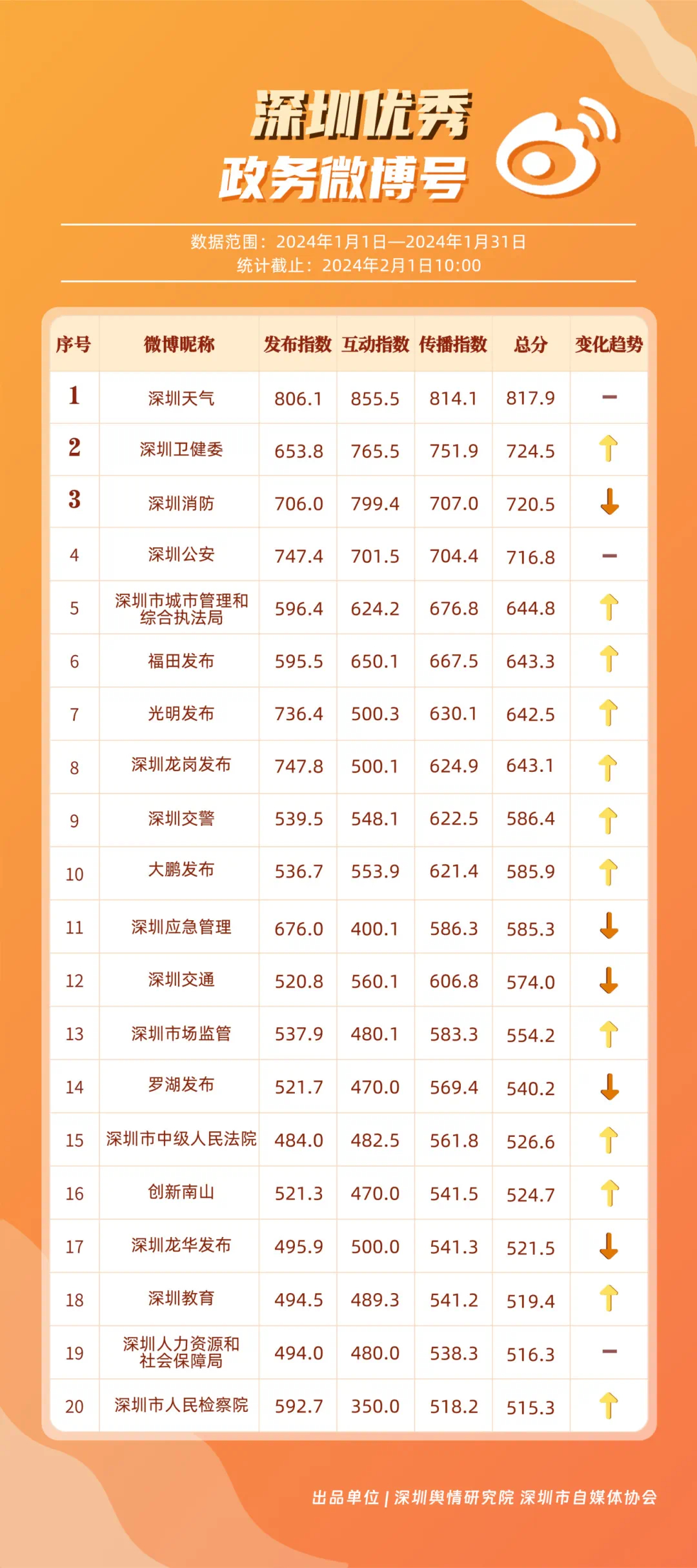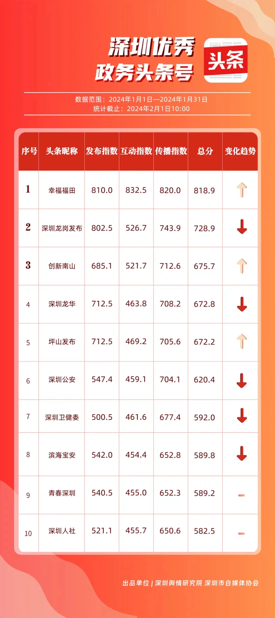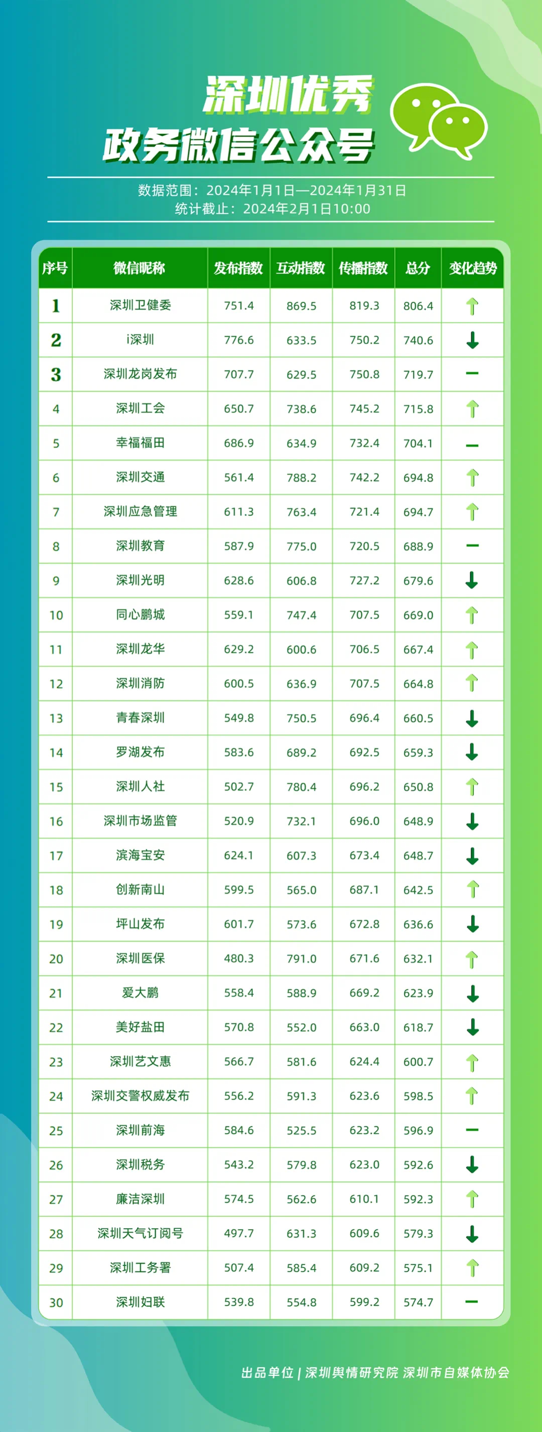 深圳新聞網(wǎng)2月9日訊(記者 陳曉君 實習(xí)生 張馳)2月8日,深圳輿情研究院、深圳市自媒體協(xié)會聯(lián)合推出《深圳優(yōu)秀政務(wù)新媒體矩陣》(2024年1月期),市衛(wèi)生健康委、市氣象局、福田區(qū)、光明區(qū)、龍崗區(qū)、龍華區(qū)、市公安局、市應(yīng)急管理局、市交通警察局、羅湖區(qū)的新媒體矩陣獲評“深圳優(yōu)秀政務(wù)新媒體矩陣”。這些矩陣在內(nèi)容發(fā)布、受眾互動和信息傳播方面取得了較好成績,并在深圳政務(wù)新媒體規(guī)范有序發(fā)展進(jìn)程中發(fā)揮著積極作用。
