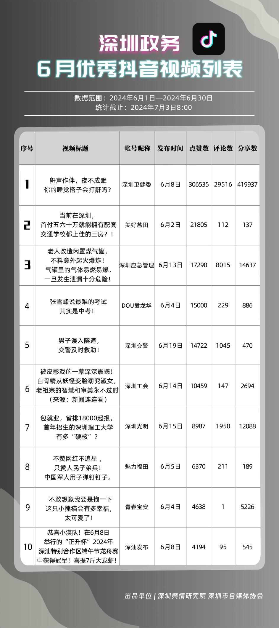 6月,“深圳衛(wèi)健委”“i深圳”“深圳龍崗發(fā)布”“幸福福田”“深圳交通”“深圳教育”“濱海寶安”“創(chuàng)新南山”“深圳工會(huì)”“青春深圳”“同心鵬城”“深圳光明”等30個(gè)政務(wù)微信公眾號(hào),被評(píng)為“深圳優(yōu)秀政務(wù)微信公眾號(hào)”。6月,“深圳衛(wèi)健委”因內(nèi)容策劃出色、受眾互動(dòng)活躍、作品火熱“出圈”等,榮登排行榜首位?!皠?chuàng)新南山”“同心鵬城”“深圳社保”“深圳教育”等上榜公眾號(hào)也積極創(chuàng)作優(yōu)質(zhì)作品,抓住時(shí)下熱點(diǎn)趨勢(shì),集中發(fā)揮政務(wù)媒體傳播力量,推動(dòng)了政務(wù)信息傳播工作提質(zhì)增效。