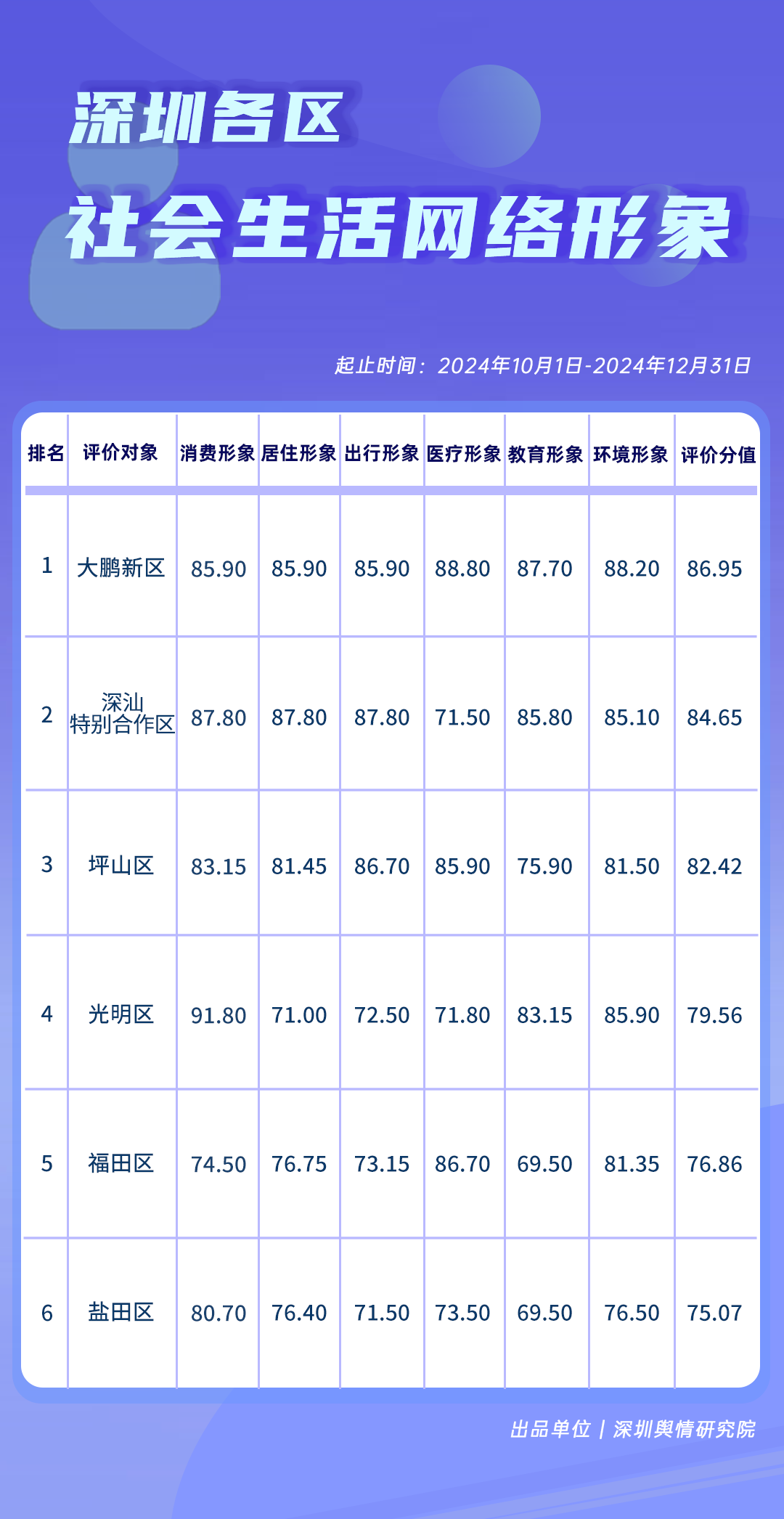 10-12月,《深圳各區(qū)社會生活網(wǎng)絡形象榜》中,大鵬新區(qū)、深汕特別合作區(qū)、坪山區(qū)綜合評價分值在80分以上,表現(xiàn)優(yōu)異。光明區(qū)、福田區(qū)、鹽田區(qū)各有所長,分別占據(jù)了榜單第四至第六的位置,成為深圳各區(qū)致力于改善社會民生、促進區(qū)域協(xié)調(diào)發(fā)展的生動范例。