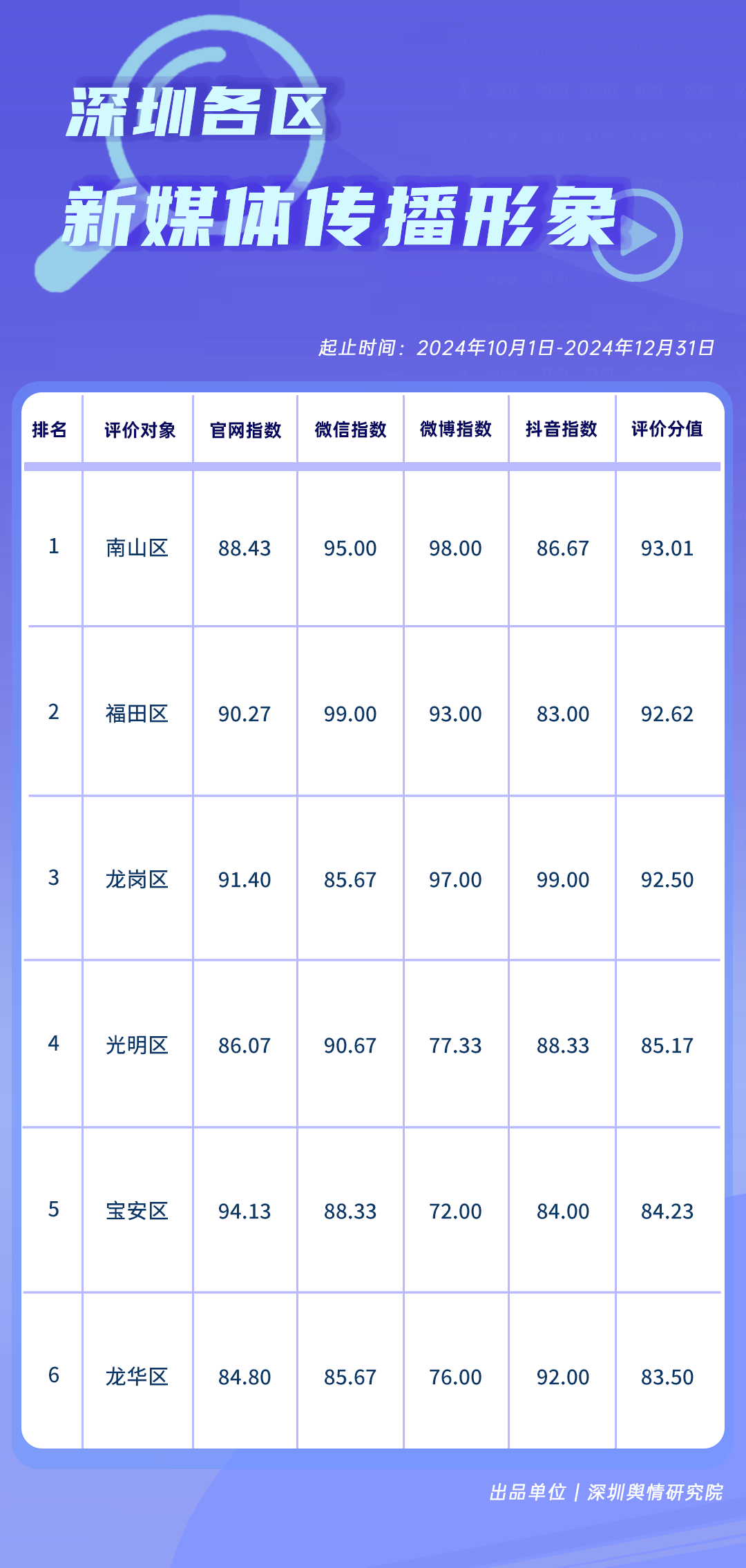 10-12月,福田區(qū)、龍崗區(qū)、光明區(qū)、龍華區(qū)、南山區(qū)、寶安區(qū)登上榜單前六。榜單中,福田區(qū)、龍崗區(qū)、光明區(qū)位列前三,綜合評價分值均在80分以上,居于榜單第四至第六名的龍華區(qū)、南山區(qū)、寶安區(qū)也在積極塑造網(wǎng)絡形象的道路上不斷邁進,展現(xiàn)了各區(qū)在網(wǎng)絡形象建設領域的蓬勃活力與持續(xù)努力。