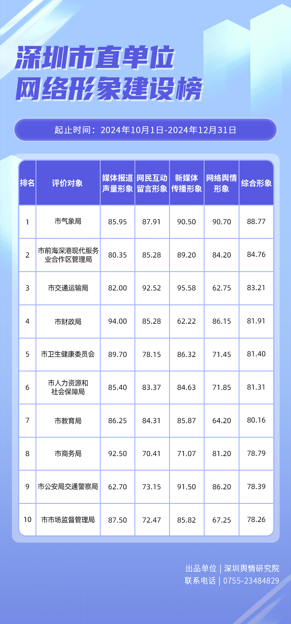 10-12月,市氣象局、市前海深港現(xiàn)代服務業(yè)合作區(qū)管理局、市交通運輸局、市財政局、市衛(wèi)生健康委員會、市人力資源和社會保障局、市教育局、市商務局、市公安局交通警察局、市市場監(jiān)督管理局在網(wǎng)絡形象建設工作方面表現(xiàn)相對突出,登上《深圳市直單位網(wǎng)絡形象建設榜》。其中,市氣象局、市前海深港現(xiàn)代服務業(yè)合作區(qū)管理局、市交通運輸局憑借其卓越的網(wǎng)絡形象建設工作,成功躋身前列,體現(xiàn)出高水平的網(wǎng)絡形象管理能力,展現(xiàn)了市直單位在新媒體時代下的責任與擔當,為構(gòu)建和諧社會環(huán)境貢獻了積極力量。