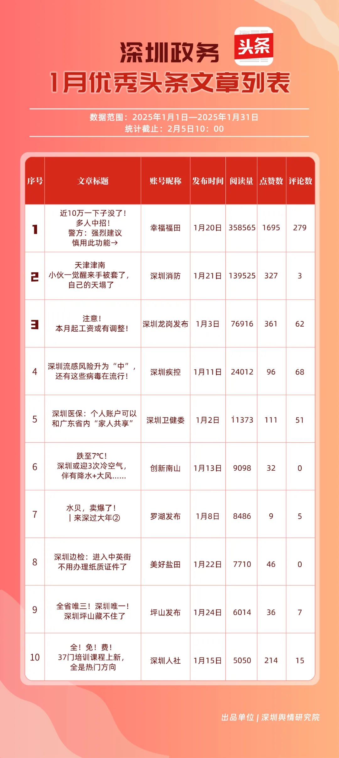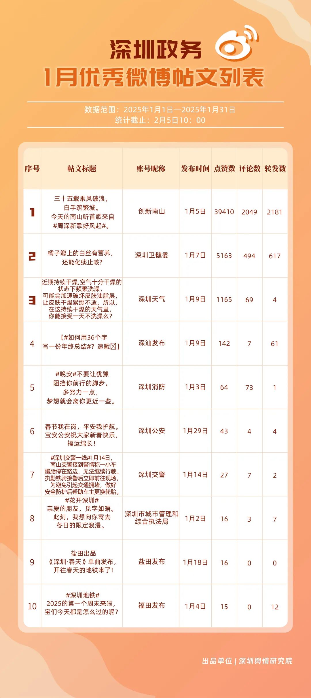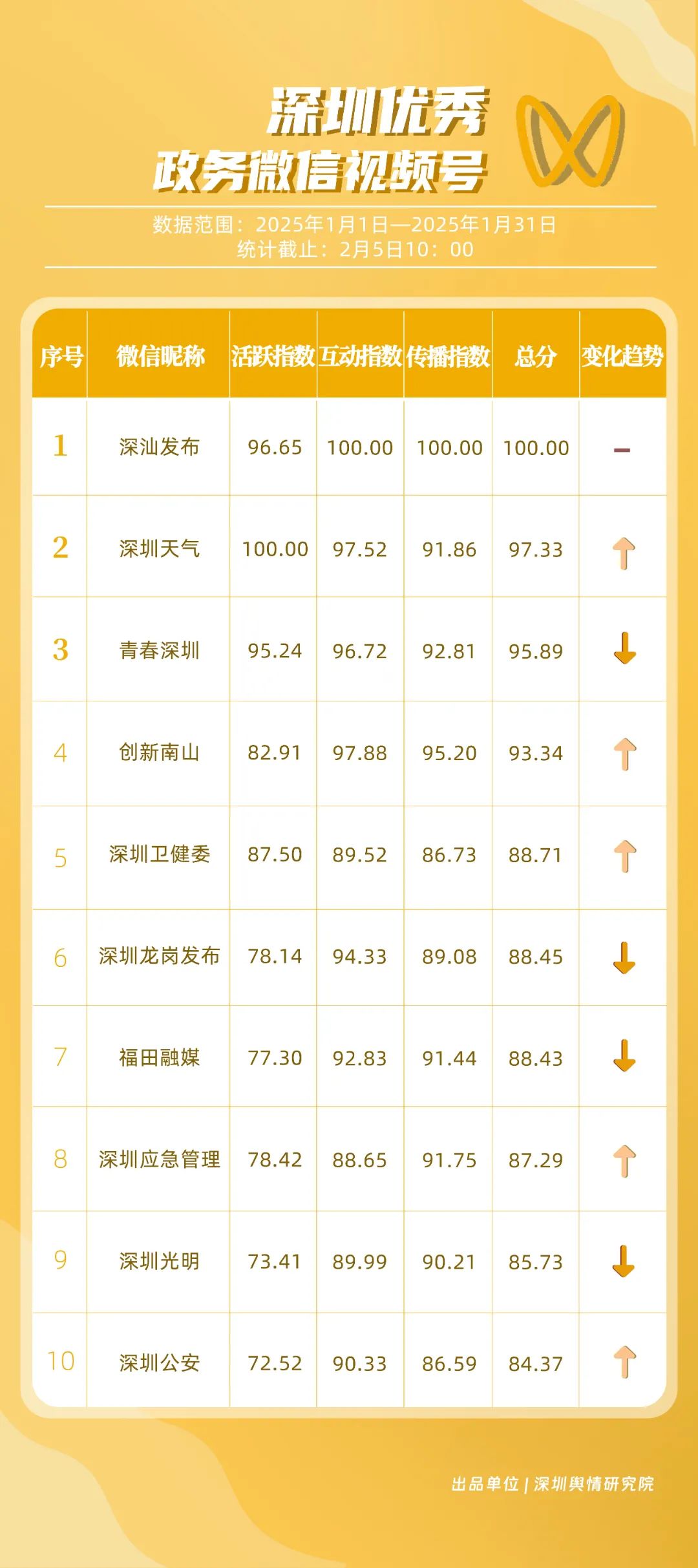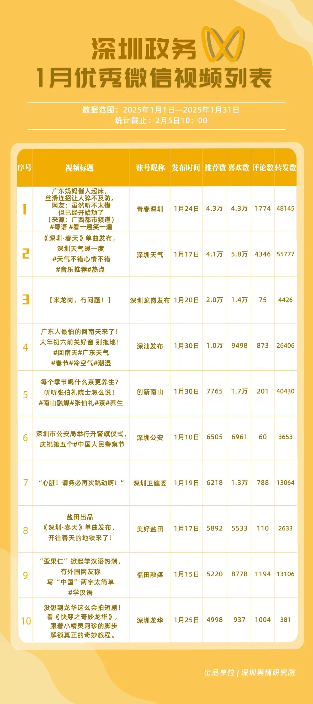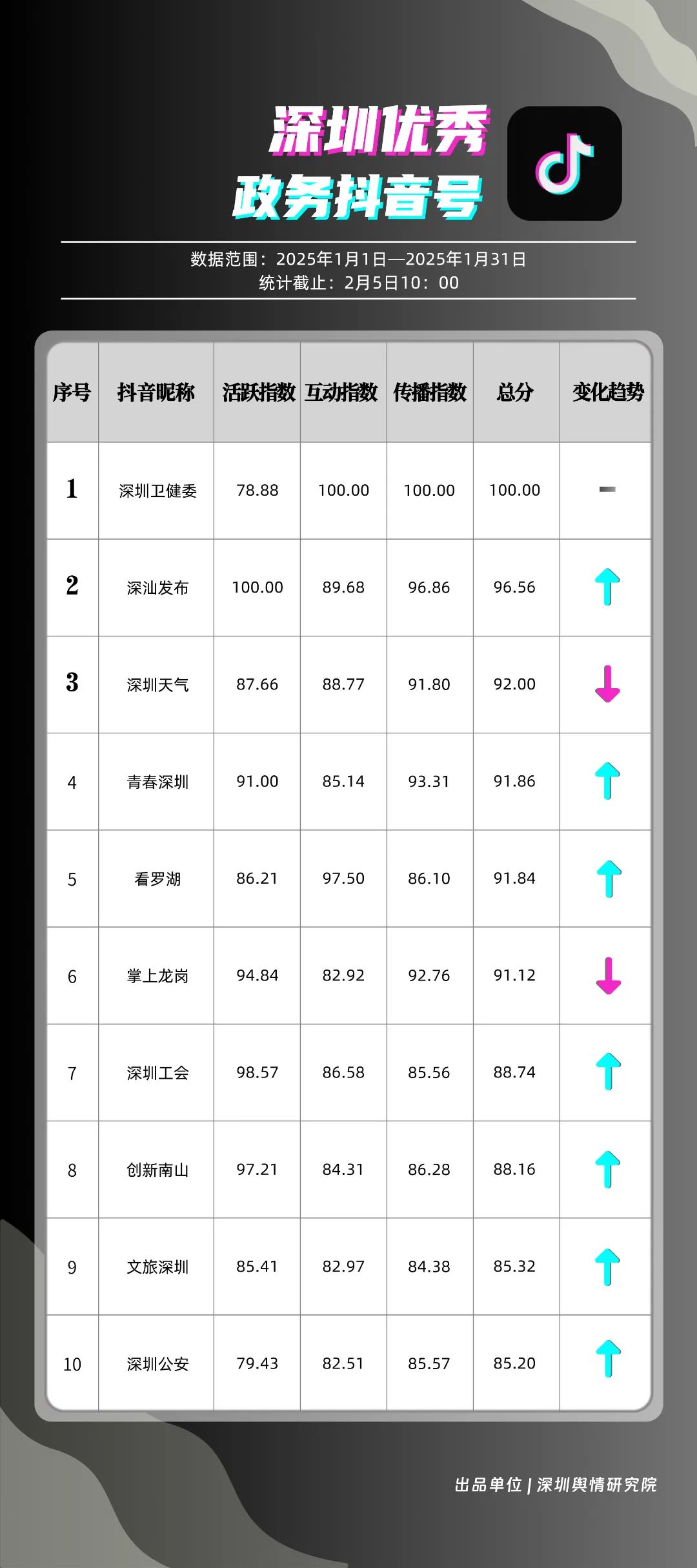 1月,“深圳衛(wèi)健委”“深汕發(fā)布”“深圳天氣”“青春深圳”“看羅湖”“掌上龍崗”“深圳工會(huì)”“創(chuàng)新南山”“文旅深圳”“深圳公安”共10個(gè)政務(wù)抖音號(hào)獲得“深圳優(yōu)秀政務(wù)抖音號(hào)”稱(chēng)號(hào)?!吧钲谛l(wèi)健委”“深汕發(fā)布”“深圳天氣”成績(jī)優(yōu)異,綜合實(shí)力較強(qiáng),位于榜單前列?!扒啻荷钲凇薄翱戳_湖”等賬號(hào)排名有所提升,彰顯了這些賬號(hào)在拓寬受眾基礎(chǔ)、增強(qiáng)用戶黏性等方面所取得的積極成效。