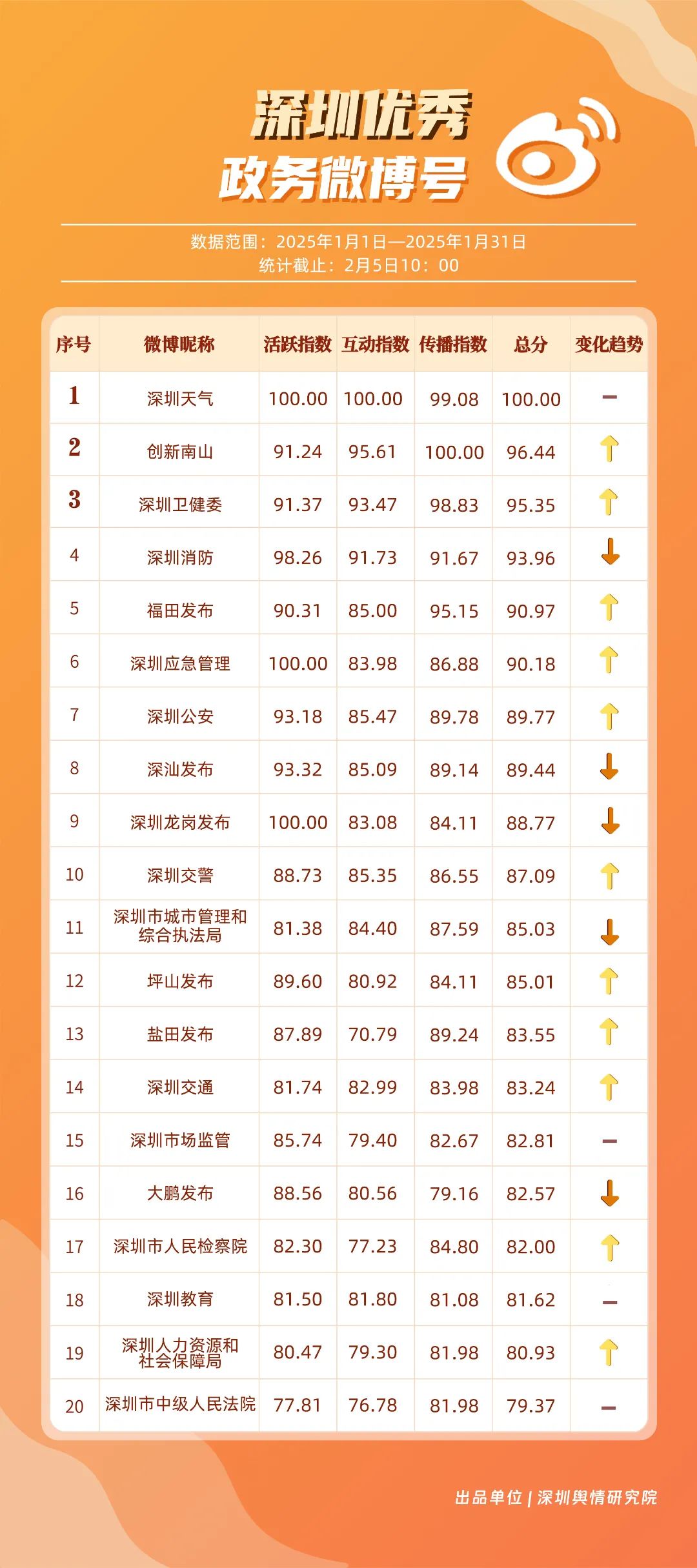 1月,“深圳天氣”“創(chuàng)新南山”“深圳衛(wèi)健委”“深圳消防”“福田發(fā)布”“深圳應(yīng)急管理”“深圳公安”“深汕發(fā)布”“深圳龍崗發(fā)布”“深圳交警”等20個(gè)賬號(hào)入選“優(yōu)秀政務(wù)微博號(hào)”?!吧钲谔鞖狻睉{借高活躍度、互動(dòng)量等獲得滿分,“創(chuàng)新南山”“深圳衛(wèi)健委”賬號(hào)則在1月發(fā)力宣傳,排名上升至榜單第二、三位。同時(shí),“深圳消防”“福田發(fā)布”“深圳應(yīng)急管理”賬號(hào)總分在90分以上,彰顯了他們?cè)谔嵘姲踩庾R(shí)、促進(jìn)政民互動(dòng)等方面所做出的積極貢獻(xiàn)。
