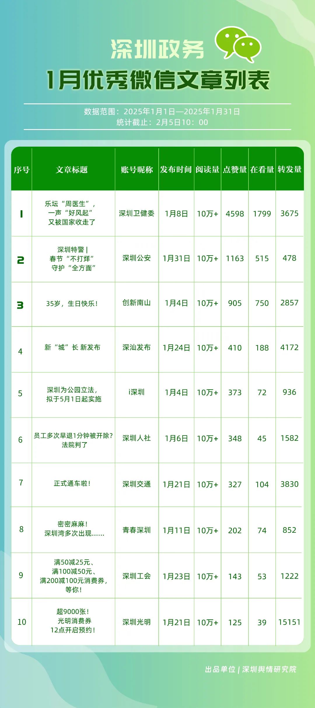 1月,“深圳衛(wèi)健委”“深圳龍崗發(fā)布”“幸福福田”“i深圳”“創(chuàng)新南山”“深圳光明”“青春深圳”“深圳工會(huì)”“羅湖發(fā)布”“濱海寶安”等30個(gè)賬號(hào)入選“深圳優(yōu)秀政務(wù)微信公眾號(hào)”。其中,“深圳衛(wèi)健委”各方面表現(xiàn)卓越,位于榜單首位,獲得總分100分?!吧钲邶垗彴l(fā)布”“青春深圳”“深圳工會(huì)”排名在本期有所提升,反映了這些賬號(hào)在內(nèi)容創(chuàng)新與受眾互動(dòng)方面的不懈努力?!癷深圳”“創(chuàng)新南山”“深圳光明”“羅湖發(fā)布”則保持了穩(wěn)健的排名,持續(xù)在政務(wù)信息的傳播中扮演著不可或缺的角色。