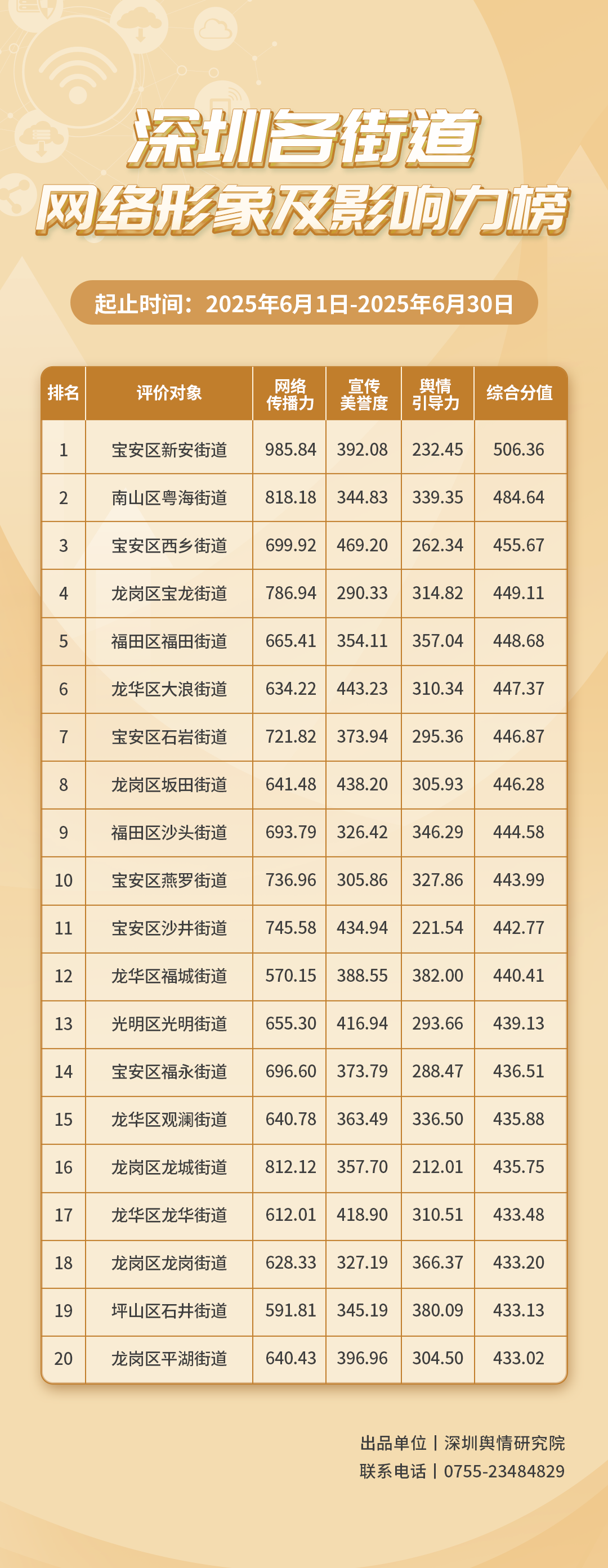 為深入了解深圳市各街道的網(wǎng)絡(luò)形象構(gòu)建狀況和社會(huì)影響,推動(dòng)街道治理“提質(zhì)增效”,增強(qiáng)城市高質(zhì)量發(fā)展動(dòng)能,深圳輿情研究院編制推出《深圳各街道網(wǎng)絡(luò)形象及影響力榜》。榜單具有獨(dú)立客觀的評(píng)價(jià)體系,通過(guò)數(shù)據(jù)采集和分析,評(píng)估各街道的網(wǎng)絡(luò)傳播力、宣傳美譽(yù)度及輿情引導(dǎo)力,并對(duì)全市11個(gè)區(qū)共78個(gè)街道的網(wǎng)絡(luò)形象及影響力進(jìn)行綜合排名。