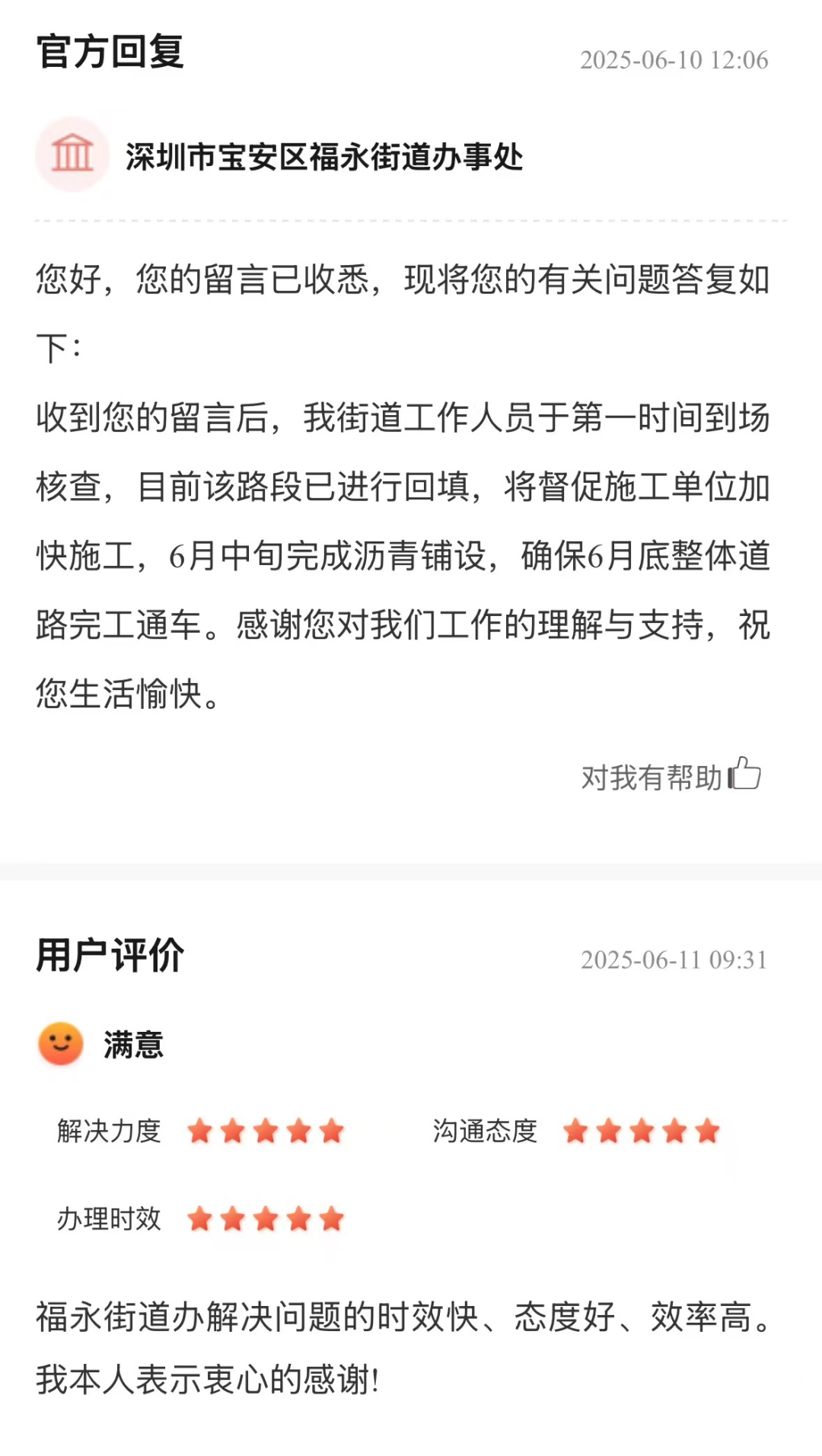 案例點(diǎn)評:道路銜接處的大坑大坎影響通行安全與道路順暢,亟待解決。街道辦收到留言后迅速行動,第一時間到場核查,明確將督促施工單位加快進(jìn)度,在預(yù)計時間內(nèi)完成瀝青鋪設(shè)及道路整體完工,這些舉措體現(xiàn)了對道路通行問題的重視和高效的處理能力,為保障道路正常通行提供了有力保障,獲得了市民的滿意評價。