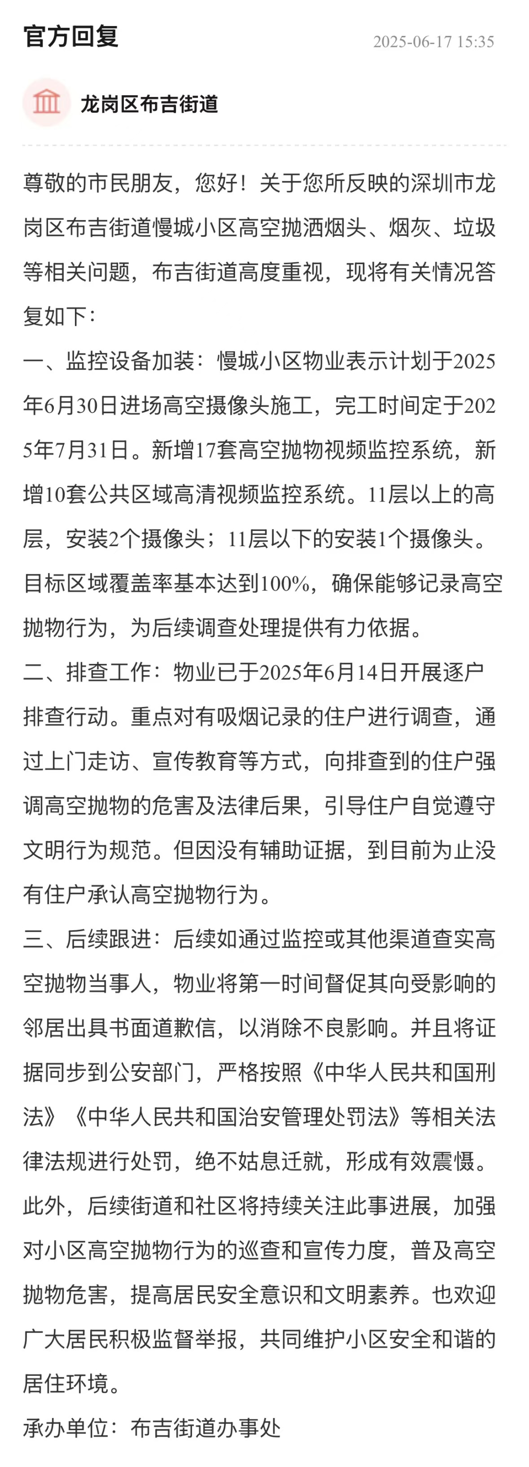 高空拋物嚴(yán)重威脅居民人身與財產(chǎn)安全,需嚴(yán)肅對待。街道辦接到相關(guān)反映后,積極推動物業(yè)規(guī)劃加裝視頻監(jiān)控系統(tǒng),明確了施工和完工時間,同時安排物業(yè)開展逐戶排查,重點(diǎn)調(diào)查有吸煙記錄住戶,體現(xiàn)出對問題的重視和解決問題的行動力。在后續(xù)保障方面,明確查實(shí)拋物當(dāng)事人后將督促其道歉并交由公安部門依規(guī)處罰,街道和社區(qū)也將持續(xù)關(guān)注、加強(qiáng)巡查與宣傳,為維護(hù)小區(qū)安全提供了有力支持。