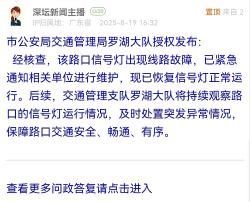 經(jīng)核查,該路口信號(hào)燈出現(xiàn)線路故障,已緊急通知相關(guān)單位進(jìn)行維護(hù),現(xiàn)已恢復(fù)信號(hào)燈正常運(yùn)行。后續(xù),交通管理支隊(duì)羅湖大隊(duì)將持續(xù)觀察路口的信號(hào)燈運(yùn)行情況,及時(shí)處置突發(fā)異常情況,保障路口交通安全、暢通、有序。