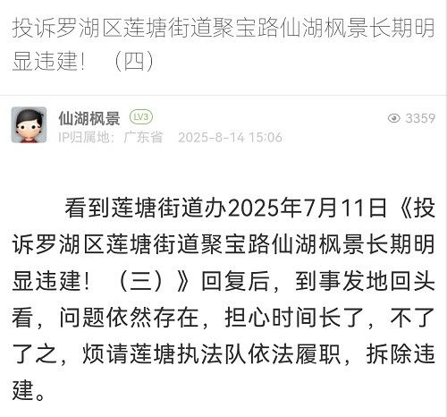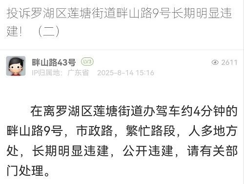 14. 帖文《投訴羅湖區(qū)蓮塘街道畔山路9號(hào)長(zhǎng)期明顯違建!(二)》