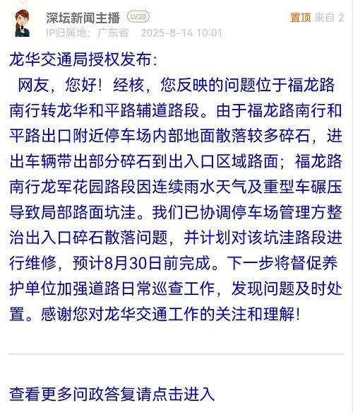 網(wǎng)友,您好!經(jīng)核,您反映的問(wèn)題位于福龍路南行轉(zhuǎn)龍華和平路輔道路段。由于福龍路南行和平路出口附近停車場(chǎng)內(nèi)部地面散落較多碎石,進(jìn)出車輛帶出部分碎石到出入口區(qū)域路面;福龍路南行龍軍花園路段因連續(xù)雨水天氣及重型車碾壓導(dǎo)致局部路面坑洼。我們已協(xié)調(diào)停車場(chǎng)管理方整治出入口碎石散落問(wèn)題,并計(jì)劃對(duì)該坑洼路段進(jìn)行維修,預(yù)計(jì)8月30日前完成。下一步將督促養(yǎng)護(hù)單位加強(qiáng)道路日常巡查工作,發(fā)現(xiàn)問(wèn)題及時(shí)處置。感謝您對(duì)龍華交通工作的關(guān)注和理解!