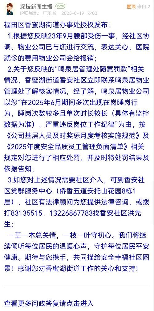 2.關(guān)于您反映的“鳴泉居管理處隨意罰款”相關(guān)情況,香蜜湖街道香安社區(qū)立即聯(lián)系鳴泉居物業(yè)管理處了解核實(shí)情況,經(jīng)了解,鳴泉居物業(yè)公司以您“在2025年6月期間多次出現(xiàn)在崗睡崗行為,睡崗次數(shù)較多且單次時(shí)長(zhǎng)較長(zhǎng)(具體有監(jiān)控?cái)?shù)據(jù)為準(zhǔn)),嚴(yán)重違反崗位工作紀(jì)律”為由,按《公司基層人員及時(shí)獎(jiǎng)懲月度考核實(shí)施規(guī)范》及《2025年度安全品質(zhì)員工管理負(fù)面清單》相關(guān)規(guī)定對(duì)您進(jìn)行了相應(yīng)處罰,并及時(shí)將處罰結(jié)果及依據(jù)告知;