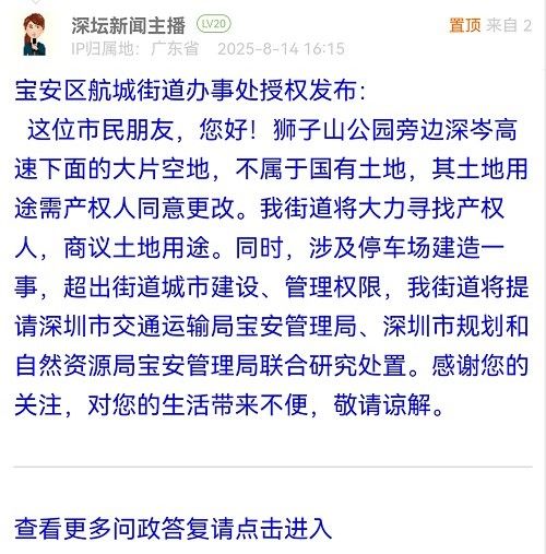 這位市民朋友,您好!獅子山公園旁邊深岑高速下面的大片空地,不屬于國(guó)有土地,其土地用途需產(chǎn)權(quán)人同意更改。我街道將大力尋找產(chǎn)權(quán)人,商議土地用途。同時(shí),涉及停車場(chǎng)建造一事,超出街道城市建設(shè)、管理權(quán)限,我街道將提請(qǐng)深圳市交通運(yùn)輸局寶安管理局、深圳市規(guī)劃和自然資源局寶安管理局聯(lián)合研究處置。感謝您的關(guān)注,對(duì)您的生活帶來(lái)不便,敬請(qǐng)諒解。