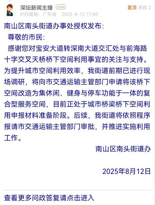 感謝您對(duì)寶安大道轉(zhuǎn)深南大道交匯處與前海路十字交叉天橋橋下空間利用事宜的關(guān)注與支持。為提升城市空間利用效率,我街道前期已進(jìn)行現(xiàn)場(chǎng)調(diào)研,將向市交通運(yùn)輸主管部門申請(qǐng)將該橋下空間改造為集休閑、健身與停車功能于一體的復(fù)合型服務(wù)空間,目前正處于城市橋梁橋下空間利用申報(bào)材料準(zhǔn)備階段。后續(xù),我街道將依照程序報(bào)請(qǐng)市交通運(yùn)輸主管部門審批,并推進(jìn)實(shí)施利用工作。