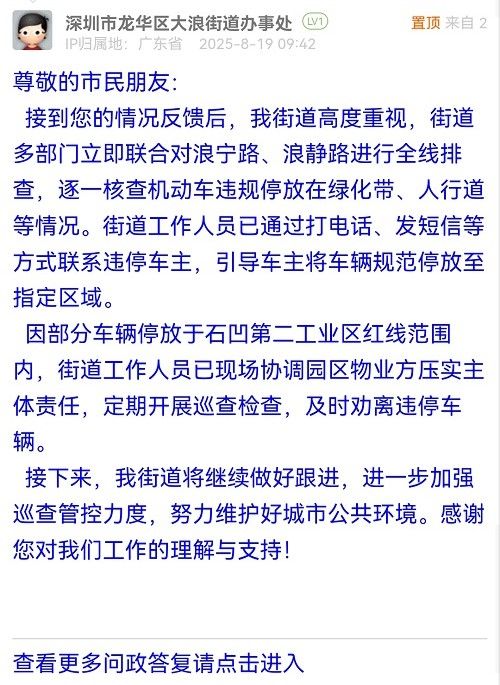 接到您的情況反饋后,我街道高度重視,街道多部門立即聯(lián)合對(duì)浪寧路、浪靜路進(jìn)行全線排查,逐一核查機(jī)動(dòng)車違規(guī)停放在綠化帶、人行道等情況。街道工作人員已通過(guò)打電話、發(fā)短信等方式聯(lián)系違停車主,引導(dǎo)車主將車輛規(guī)范停放至指定區(qū)域。