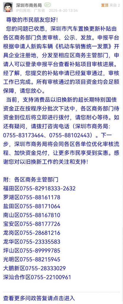 您的問(wèn)題已收悉,深圳市汽車置換更新補(bǔ)貼由各區(qū)商務(wù)部門負(fù)責(zé)審核、公示、發(fā)放。申報(bào)平臺(tái)根據(jù)申請(qǐng)人新購(gòu)車輛《機(jī)動(dòng)車銷售統(tǒng)一發(fā)票》開(kāi)具企業(yè)注冊(cè)地,分發(fā)至相應(yīng)區(qū)商務(wù)主管部門,申請(qǐng)人可以登錄申報(bào)平臺(tái)查看補(bǔ)貼項(xiàng)目審核進(jìn)展。經(jīng)了解,您提交的補(bǔ)貼申請(qǐng)已經(jīng)復(fù)審?fù)ㄟ^(guò),審核工作已完成。所有審核通過(guò)的項(xiàng)目資金均會(huì)足額保障,請(qǐng)您放心。