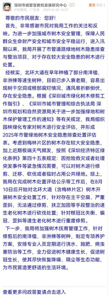 經(jīng)核實(shí),北環(huán)大道在早年種植了部分南洋楹、非洲楝等速生樹(shù)種,目前已步入衰老期,容易出現(xiàn)樹(shù)干空洞或根部腐爛情況,遇風(fēng)易折斷倒伏,存在安全隱患。根據(jù)《深圳城市綠化樹(shù)木修剪工作指引》、《深圳市城市管理和綜合執(zhí)法局 深圳市規(guī)劃和自然資源局關(guān)于進(jìn)一步加強(qiáng)綠地和樹(shù)木保護(hù)管理工作的通知》等有關(guān)規(guī)定,我局組織園林綠化專家對(duì)樹(shù)木進(jìn)行安全評(píng)估,并形成2025年市管綠地樹(shù)木安全隱患排查處置評(píng)估表。考慮到梅林片區(qū)的樹(shù)木存在較大安全隱患,加上近期極端天氣頻發(fā),按照《深圳經(jīng)濟(jì)特區(qū)綠化條例》第四十五條規(guī)定:因搶險(xiǎn)救災(zāi)或者處理突發(fā)事件等緊急情況需要,可以對(duì)樹(shù)木進(jìn)行修剪、遷移、砍伐或者臨時(shí)占用公共綠地。綜上,我局在完成樹(shù)木處置評(píng)估公示等工作后,在8月10日后開(kāi)始對(duì)北環(huán)大道(含梅林片區(qū))樹(shù)木開(kāi)展樹(shù)木安全處置工作,針對(duì)存在主干空腐、嚴(yán)重歪斜,無(wú)法通過(guò)修剪、扶正加固等手段整治的速生老化樹(shù)木進(jìn)行砍伐處置;針對(duì)根冠比失衡、偏冠、歪斜等速生老化樹(shù)木進(jìn)行重度修剪。