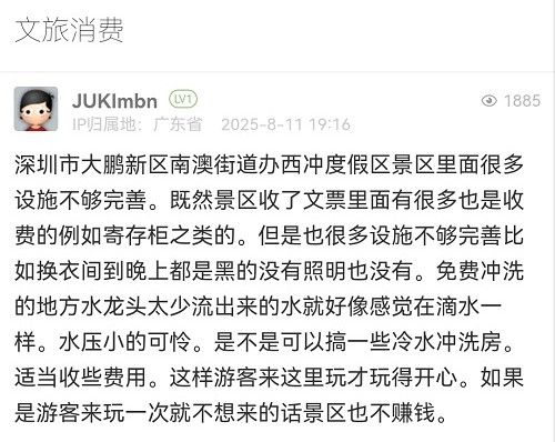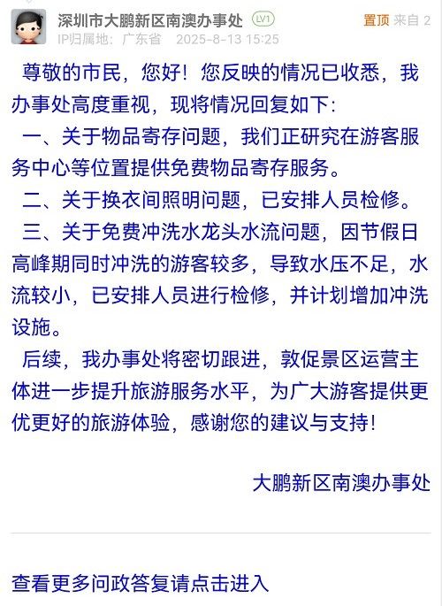 三、關(guān)于免費(fèi)沖洗水龍頭水流問(wèn)題,因節(jié)假日高峰期同時(shí)沖洗的游客較多,導(dǎo)致水壓不足,水流較小,已安排人員進(jìn)行檢修,并計(jì)劃增加沖洗設(shè)施。