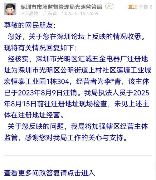 尊敬的網(wǎng)民朋友:您好,關(guān)于您在深圳論壇上反映的情況收悉?,F(xiàn)將有關(guān)情況回復(fù)如下:經(jīng)核實(shí),深圳市光明區(qū)匯誠(chéng)五金電器廠注冊(cè)地址為深圳市光明區(qū)公明街道上村社區(qū)蓮塘工業(yè)城宏恒泰工業(yè)園1棟304,經(jīng)營(yíng)者為李*青,該主體已于2023年8月9日注銷。我局執(zhí)法人員于2025年8月15日前往注冊(cè)地址現(xiàn)場(chǎng)檢查,未見(jiàn)上述主體在注冊(cè)地址經(jīng)營(yíng)。關(guān)于您反映的問(wèn)題,我局將加強(qiáng)轄區(qū)經(jīng)營(yíng)主體監(jiān)管,感謝您對(duì)我局工作的關(guān)心與支持。