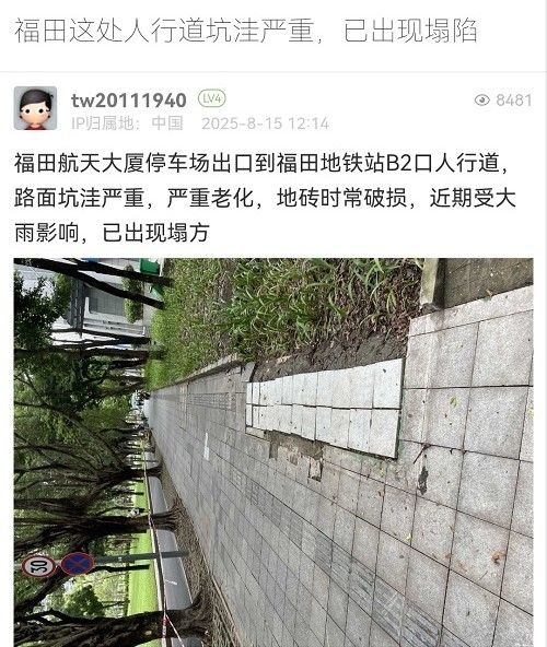 19. 帖文《福田這處人行道坑洼嚴(yán)重,已出現(xiàn)塌陷》
