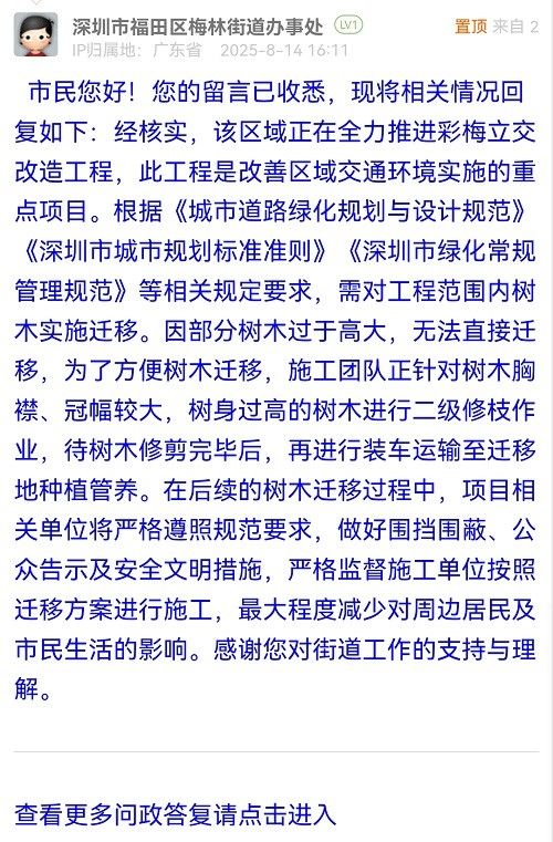 市民您好!您的留言已收悉,現(xiàn)將相關(guān)情況回復(fù)如下:經(jīng)核實(shí),該區(qū)域正在全力推進(jìn)彩梅立交改造工程,此工程是改善區(qū)域交通環(huán)境實(shí)施的重點(diǎn)項(xiàng)目。根據(jù)《城市道路綠化規(guī)劃與設(shè)計(jì)規(guī)范》《深圳市城市規(guī)劃標(biāo)準(zhǔn)準(zhǔn)則》《深圳市綠化常規(guī)管理規(guī)范》等相關(guān)規(guī)定要求,需對(duì)工程范圍內(nèi)樹(shù)木實(shí)施遷移。因部分樹(shù)木過(guò)于高大,無(wú)法直接遷移,為了方便樹(shù)木遷移,施工團(tuán)隊(duì)正針對(duì)樹(shù)木胸襟、冠幅較大,樹(shù)身過(guò)高的樹(shù)木進(jìn)行二級(jí)修枝作業(yè),待樹(shù)木修剪完畢后,再進(jìn)行裝車運(yùn)輸至遷移地種植管養(yǎng)。在后續(xù)的樹(shù)木遷移過(guò)程中,項(xiàng)目相關(guān)單位將嚴(yán)格遵照規(guī)范要求,做好圍擋圍蔽、公眾告示及安全文明措施,嚴(yán)格監(jiān)督施工單位按照遷移方案進(jìn)行施工,最大程度減少對(duì)周邊居民及市民生活的影響。感謝您對(duì)街道工作的支持與理解。