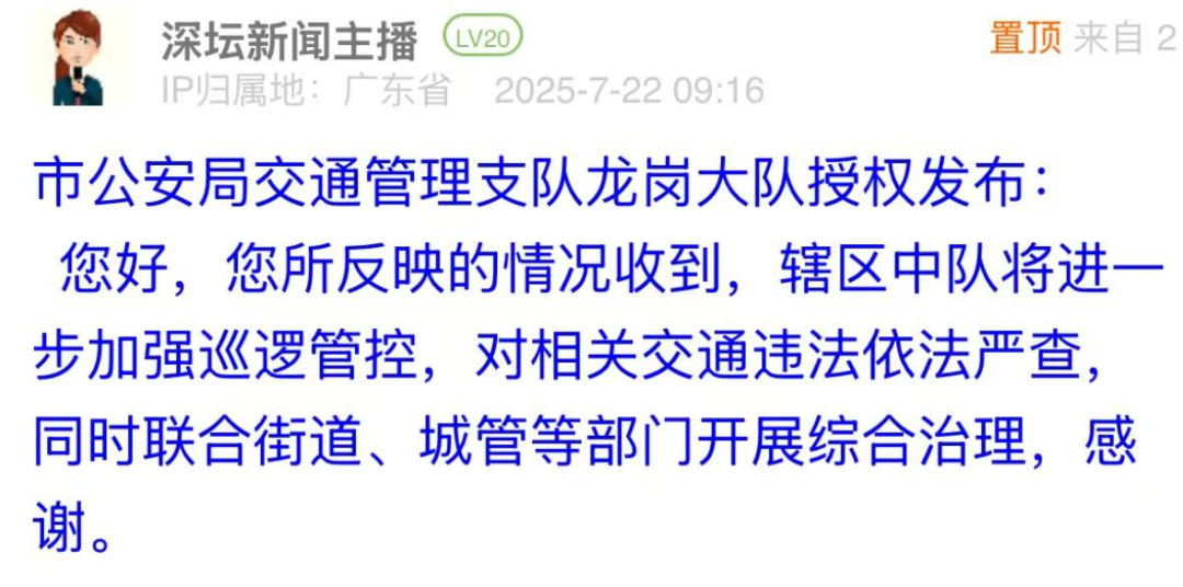 案例點(diǎn)評:對于市民反映的路面油污問題,布吉街道辦立即安排環(huán)衛(wèi)部門進(jìn)行清洗,并于第二日在問政帖文下進(jìn)行回復(fù),以現(xiàn)場圖片展示路面清理效果,表示將加強(qiáng)后續(xù)巡查。此次處置展現(xiàn)了基層部門高效務(wù)實(shí)的問題處理能力,為城市道路環(huán)境管理提供了快速響應(yīng)與長效維護(hù)相結(jié)合的實(shí)踐范例,切實(shí)回應(yīng)了市民對潔凈環(huán)境的期待。